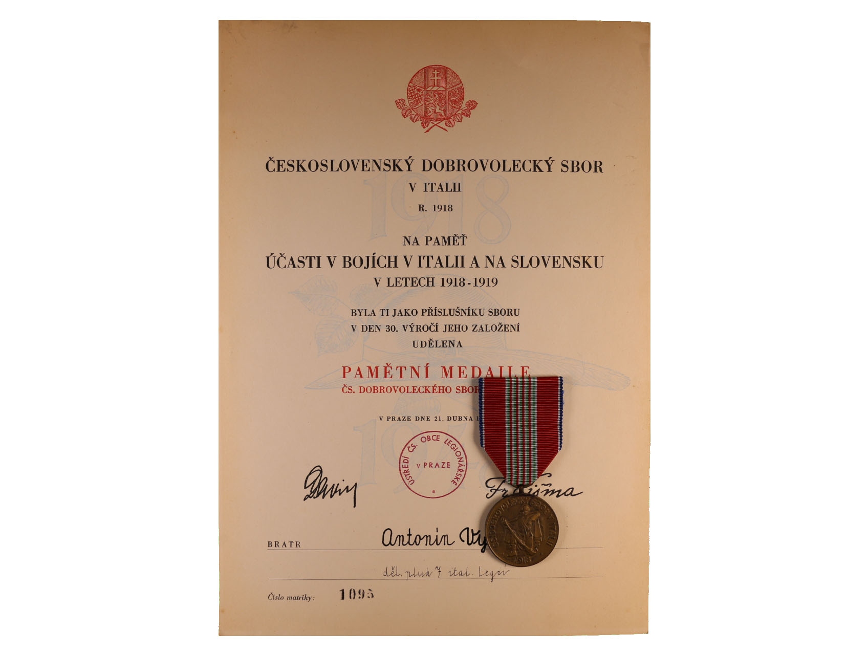 2744 Pam. medaile ČS dobrovolnického sboru v Itálii, dekret + 6 různých potvrzení a výpisů, N78, VM113 500