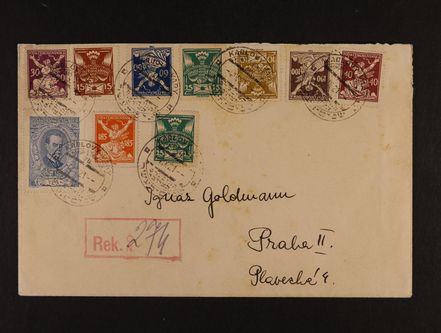 R-dopis do Prahy frank. pestrou frankaturou TGM 1920 + Holubice + OR s pod. dvojjazyčným raz. KARLOVY VARY KONGRES SIONISTICKÝ 4.9.21