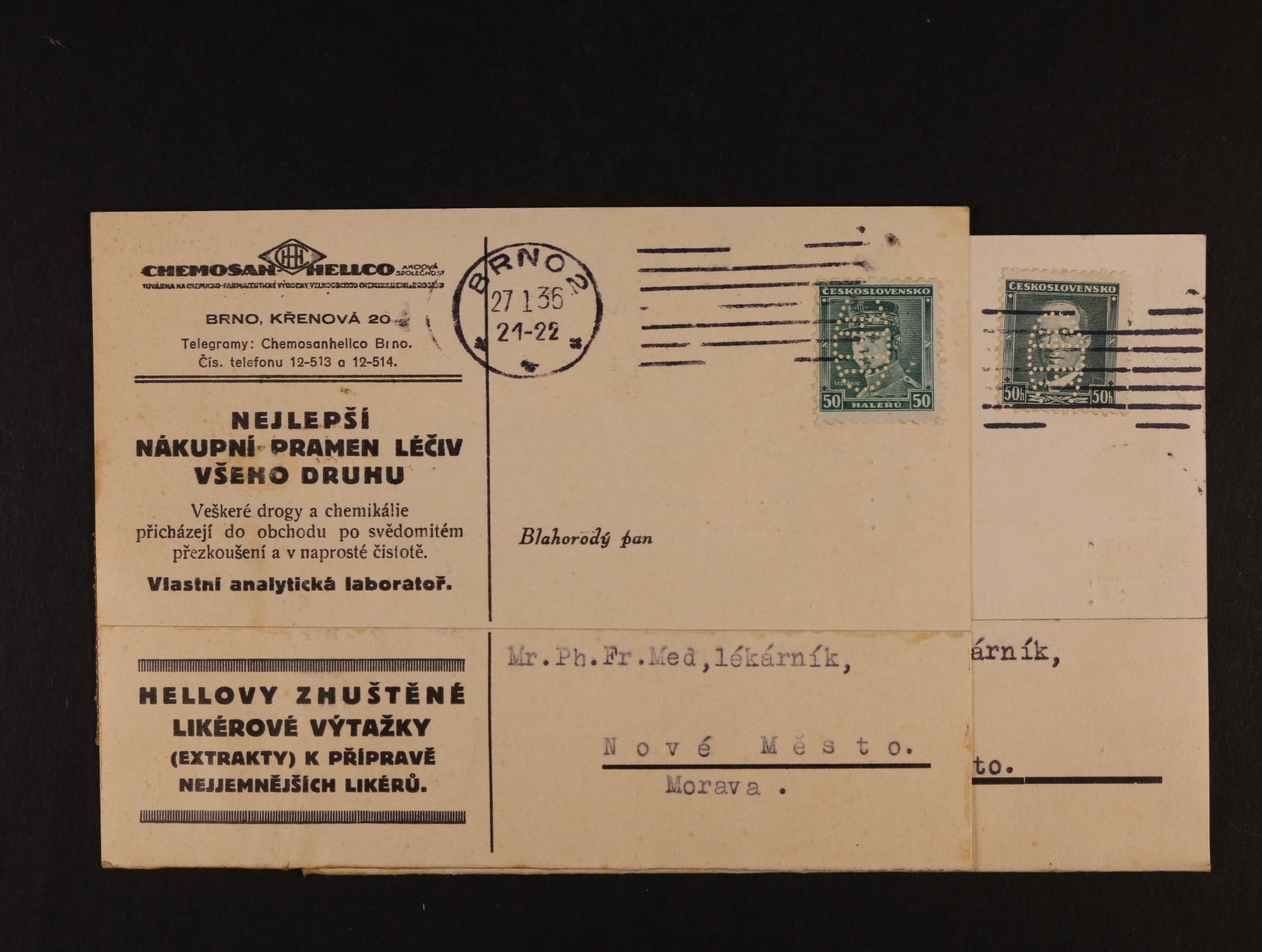 ČSR I - dva firemní KL z r. 1936 frank. zn. č. 291, resp. 301 s perfinem fy. CHEMOSAN HELLCO BRNO