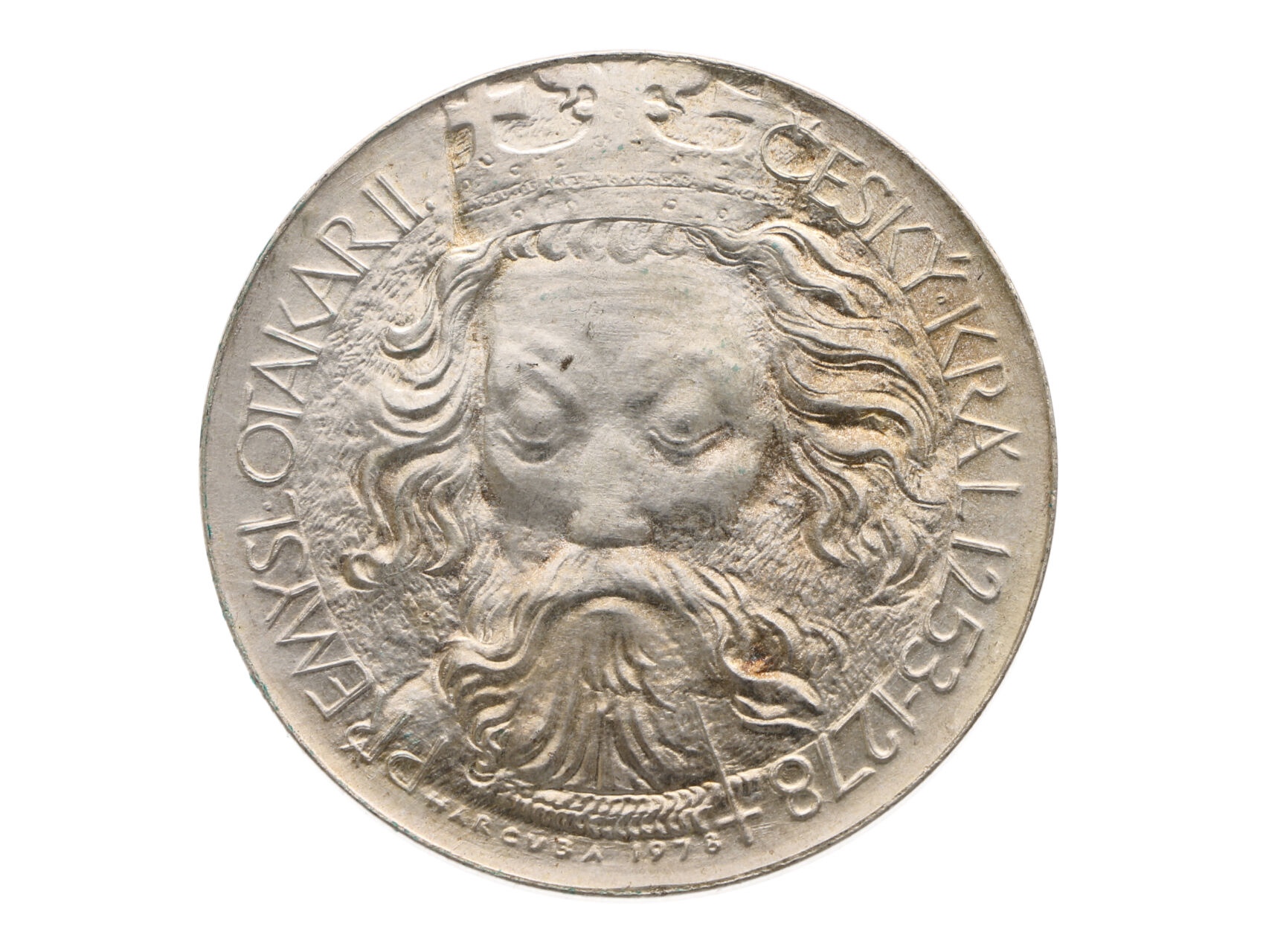 ČNS - pobočka v Plzni - AR medaile 1978, Přemysl Otakar II. Portrét krále podle busty P. Parléře, opis / jezdecká pečeť krále z posledních let vlády s gotickým opisem, opis.. Stříbro 40 mm, 29,81 g, na hraně punc Ag, ryzostní značka 900 a značka výrobce MK, signováno Harcuba, raženo 10 ks, F.A28/6b