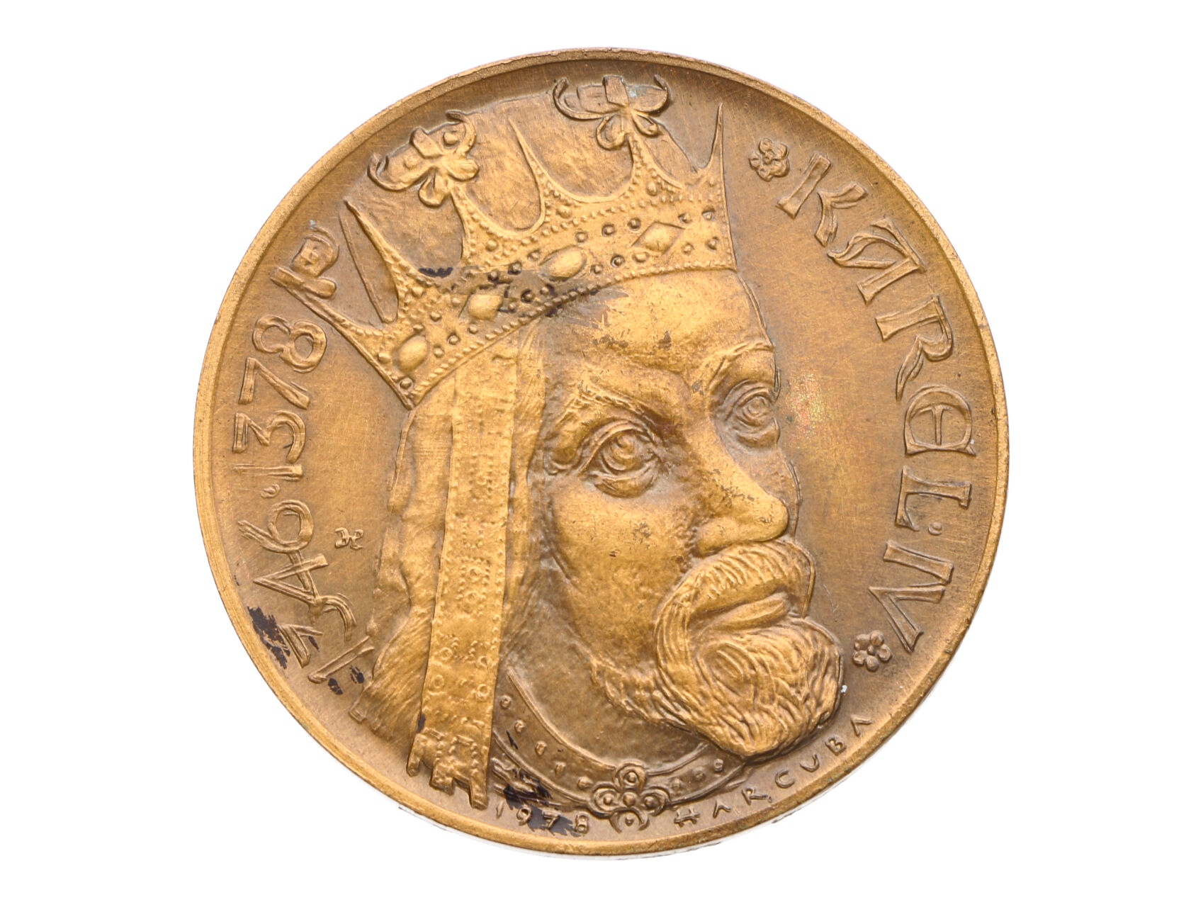 ČSPDP Praha - AE medaile 1978, Karel IV. portrét. Uprostřed český lev, dvouřádkový opis / korunovaný portrét Karla IV. zprava, opis, (motiv nepřijatého návrhu pro ražbu 1 dukátu). Bronz 38 mm, 22,46 g, signováno Harcuba, náklad 210 ks, F.C12/4c