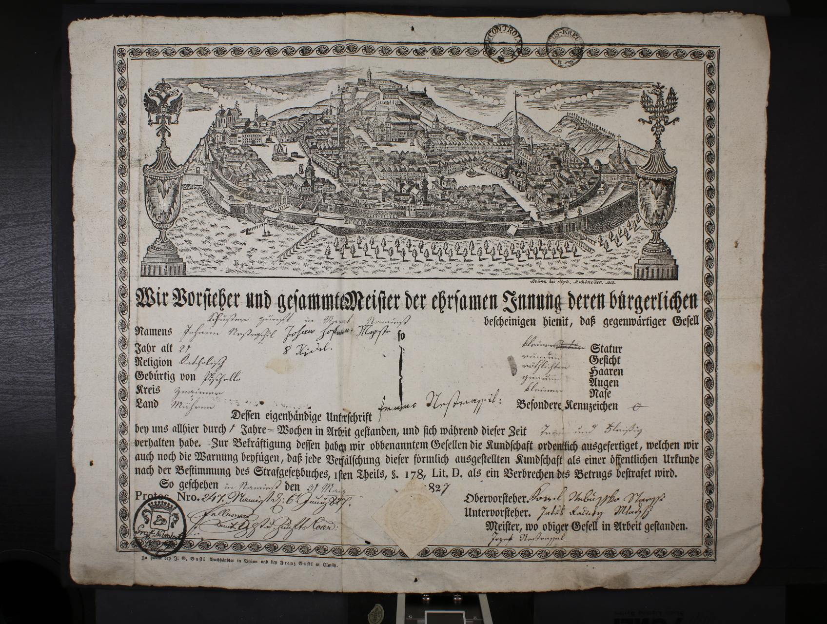 úřední listina formátu 44,5 x 37 cm s Vedutou Brna z r. 1827 a suchou neporušenou pečetí, několikrát přeloženo