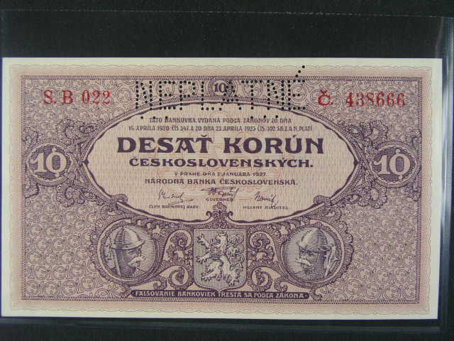 10 Kc 2.1.1927 serie B, 1x perf. NEPLATNE, Ba. 22c, Pi. 20, stopy po klihu jinak N