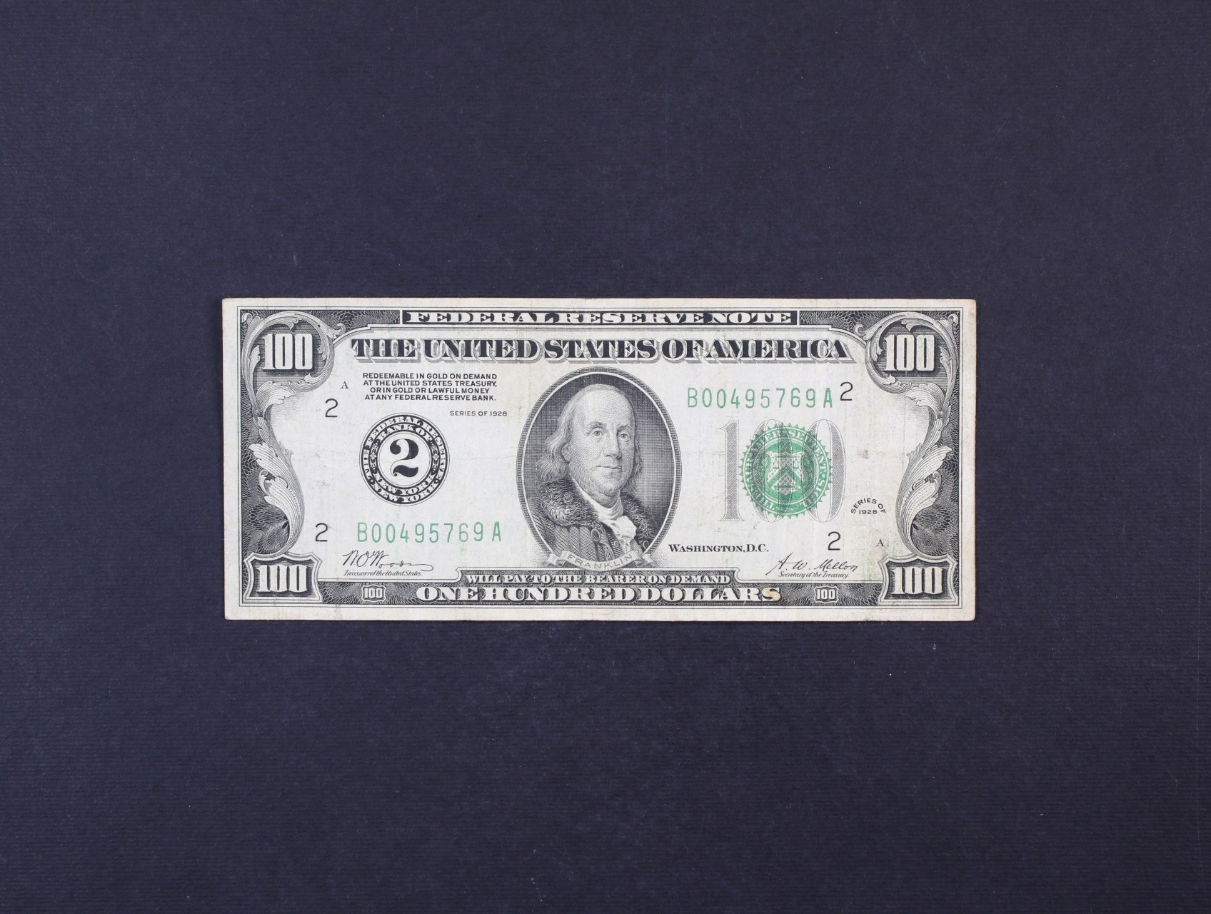 100 Dollars 1928 (2 New York / New York) Federal Reserve Note, tmavě zelená pečeť, Pi. 424