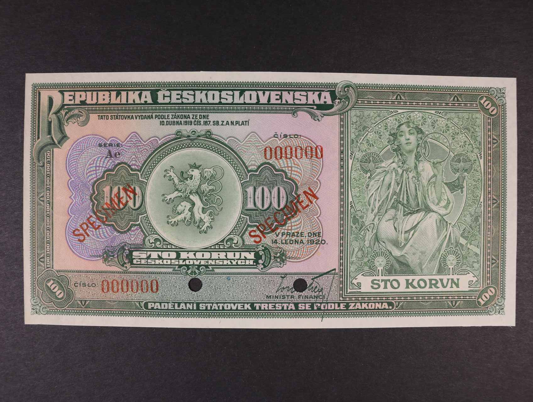 • 100 Kč 14.1.1920 série Ae anulát s 2x přetiskem SPECIMEN + 2x perf. otvor, Ba. 16s, Pi. 17s