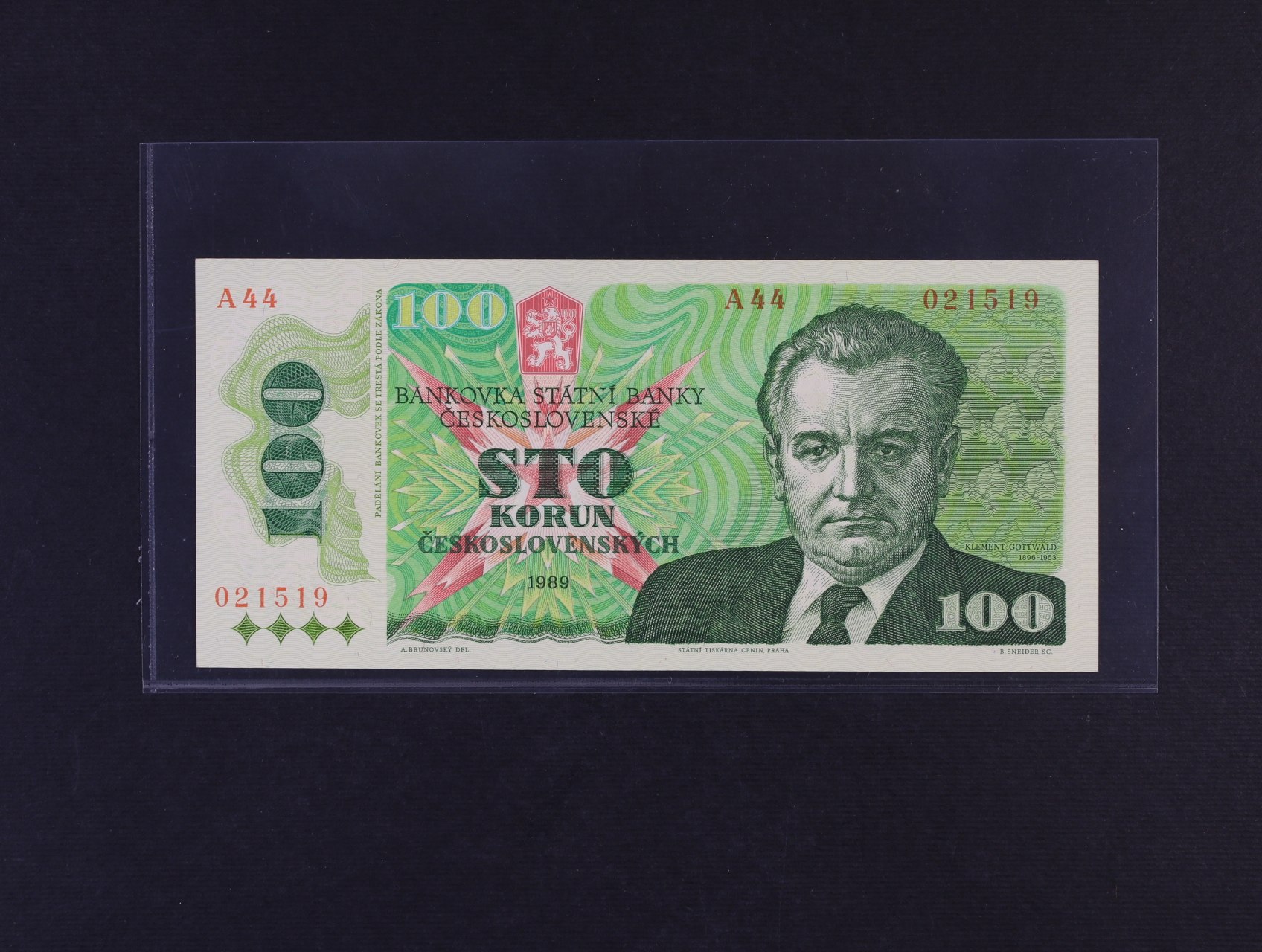 • 100 Kčs 1989 série A 44, Ba. 106, Pi. 97, vzácně se vyskytující vysoká série