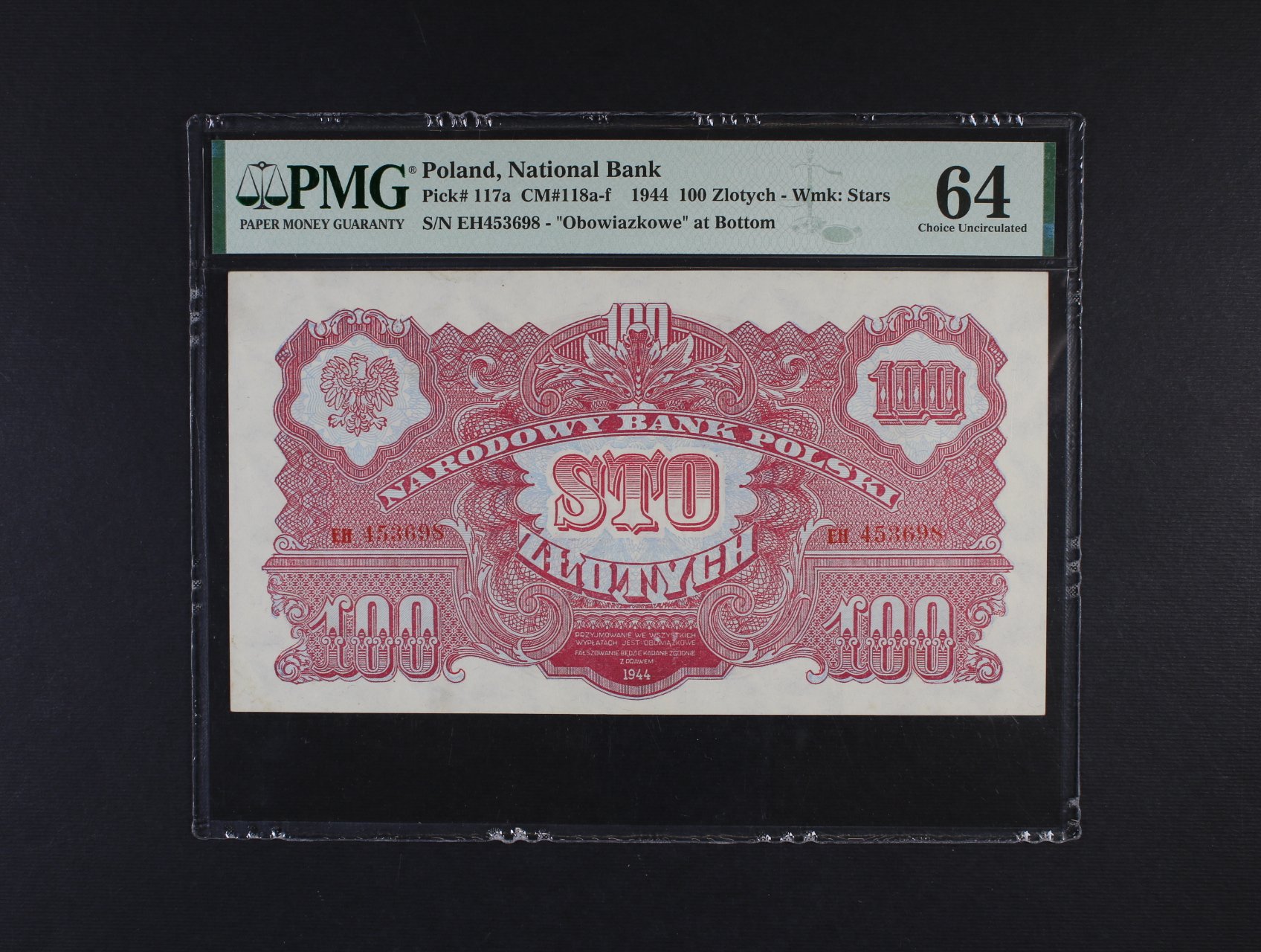 • 100 Zlotych 1944 série EH II.vydání (Obowiazkowe), Pi. 117a, BNB. B808b, Mil.118a, PMG 64, vzácná