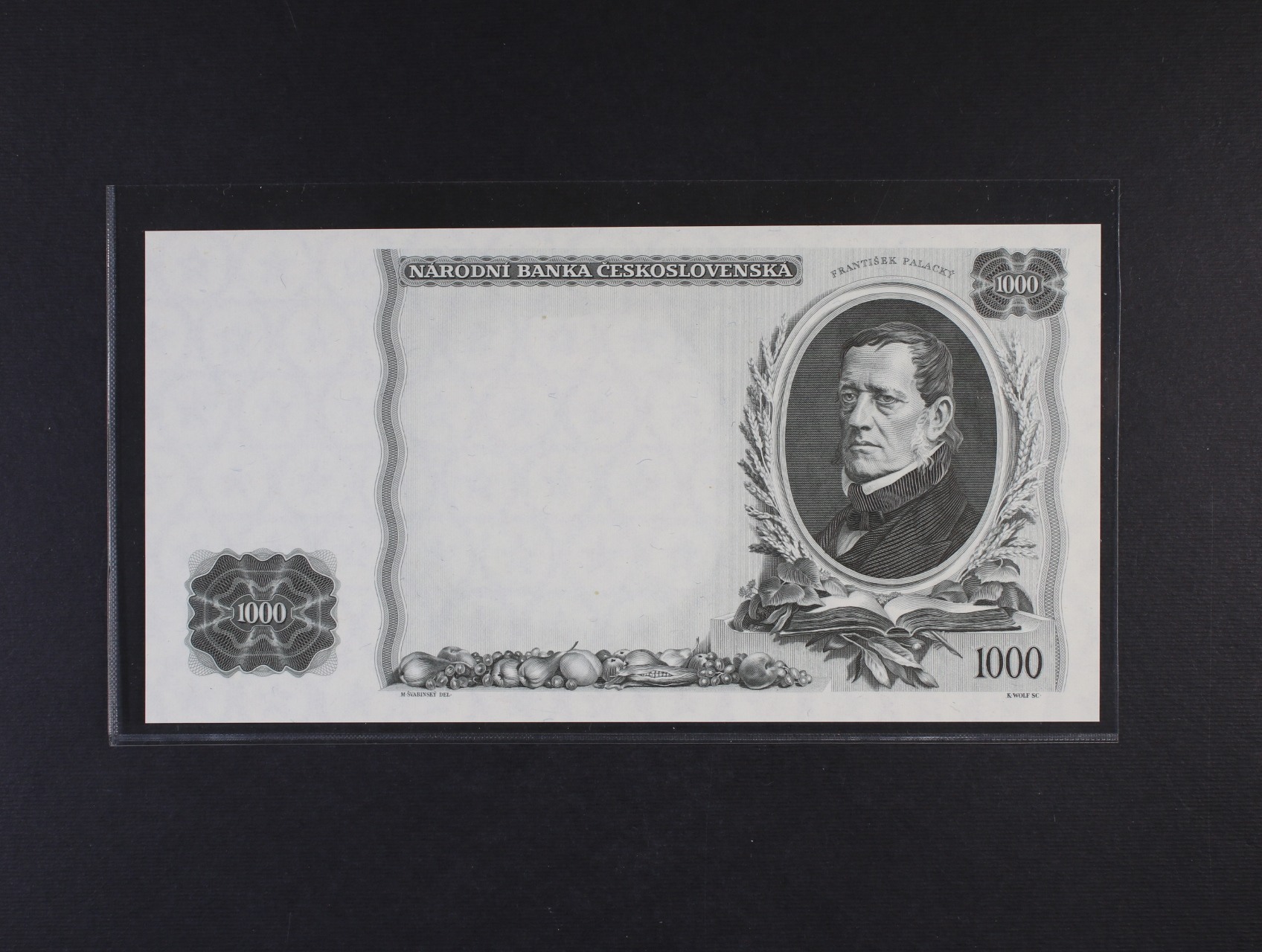 • 1000 Kč 1934, hlubotiskový nátisk líce na papíře s vodoznakem