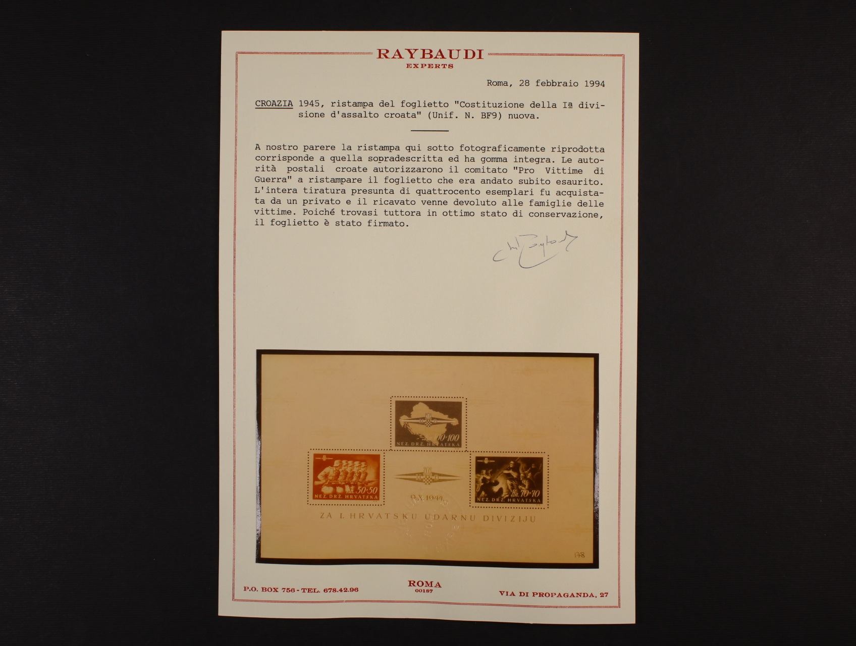 1945 Unifil N.BF9, aršík "Sturmdivision", oficiální vydání chorvatské exilové vlády pro dobročinné účely; vydání komise "Pro Vitime di Guerra", náklad jen 400ks, bezvadné, atest Raybaudi