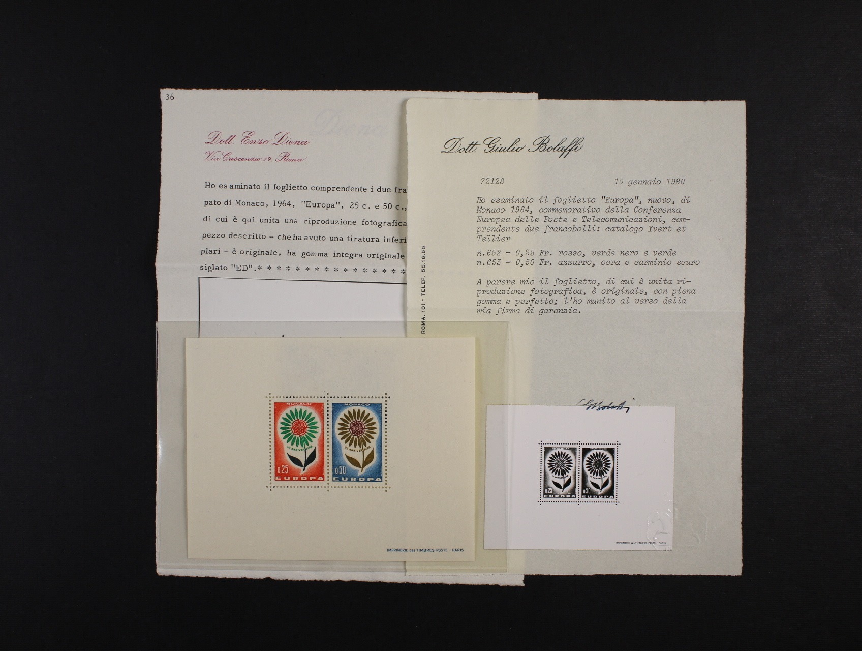 1964 Blocs Spéciaux / Yvert. č. 6, aršík EUROPA 0,25fr+0,50fr; luxusní, s atesty Diena a Bolaffi, kat. 1700 EUR, zcela ojedinělý výskyt, nejdražší aršík celého Monaka