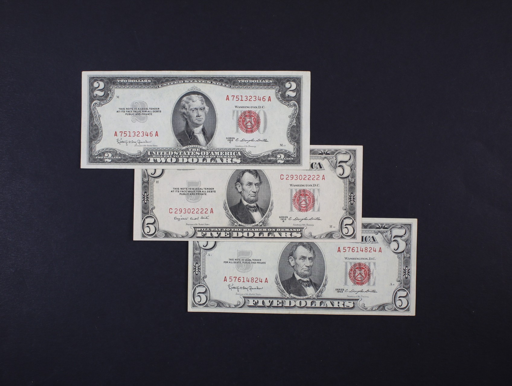 2 Dollars 1953 C, 5 Dollars 1953 B, 1963 United States Notes - červené pečetě, Pi. 3380 c, 381 b, 383, 3 kusy