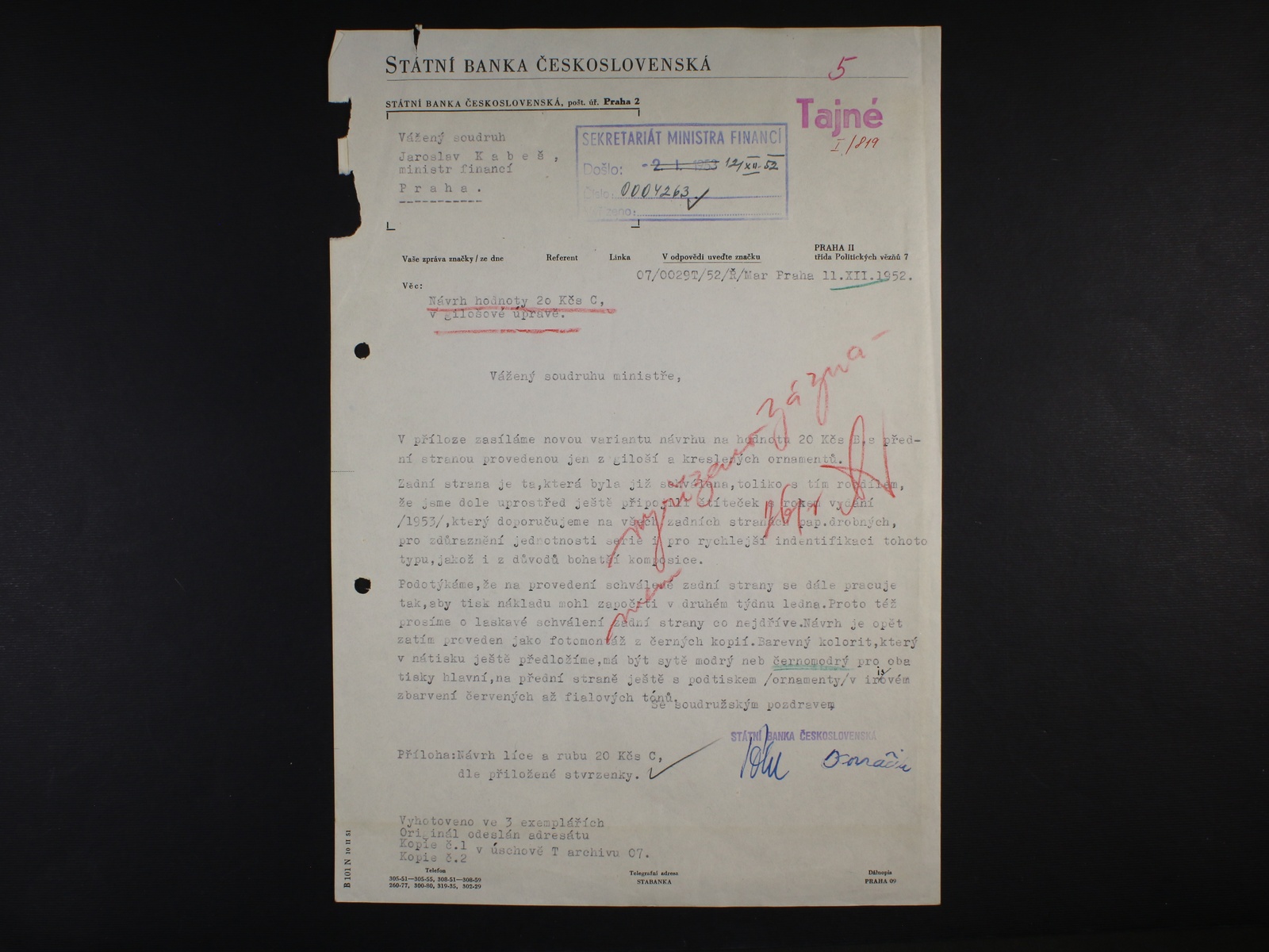 20 Kčs 25.2.1953 série A 00 anulát, původní varianta návrhu, tištěna v pozměněné stavu, nevydaná, koláž, unikát, včetně původního tajného dopisu SBČ na ministersto financí, mimořádná nabídku