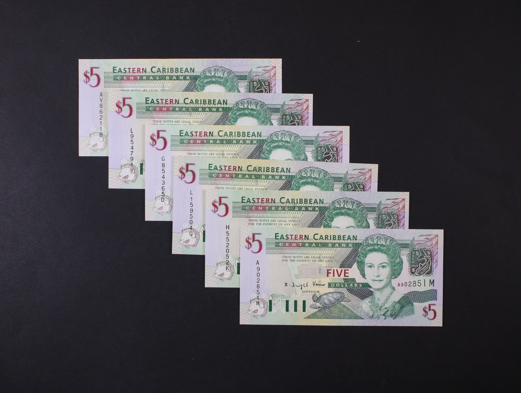 5 Dollars b.d. (2003) série D (Dominica), G (Grenada), K (St. Kitts), M (Monserrat), V (St. Vincent), 2008 série AV, Pi. 42, 47, BNB. B226d, g, k, m, v, B231a, 6 kusů