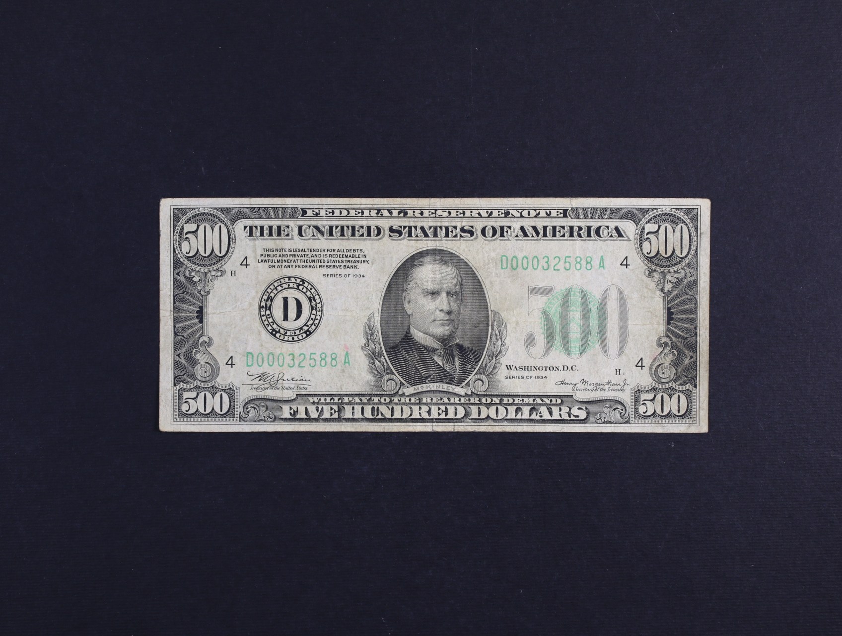 500 Dollars 1934 (D Cleveland / Ohio) Federal Reserve Note, tmavě zelená pečeť, Pi. 434, vzácný