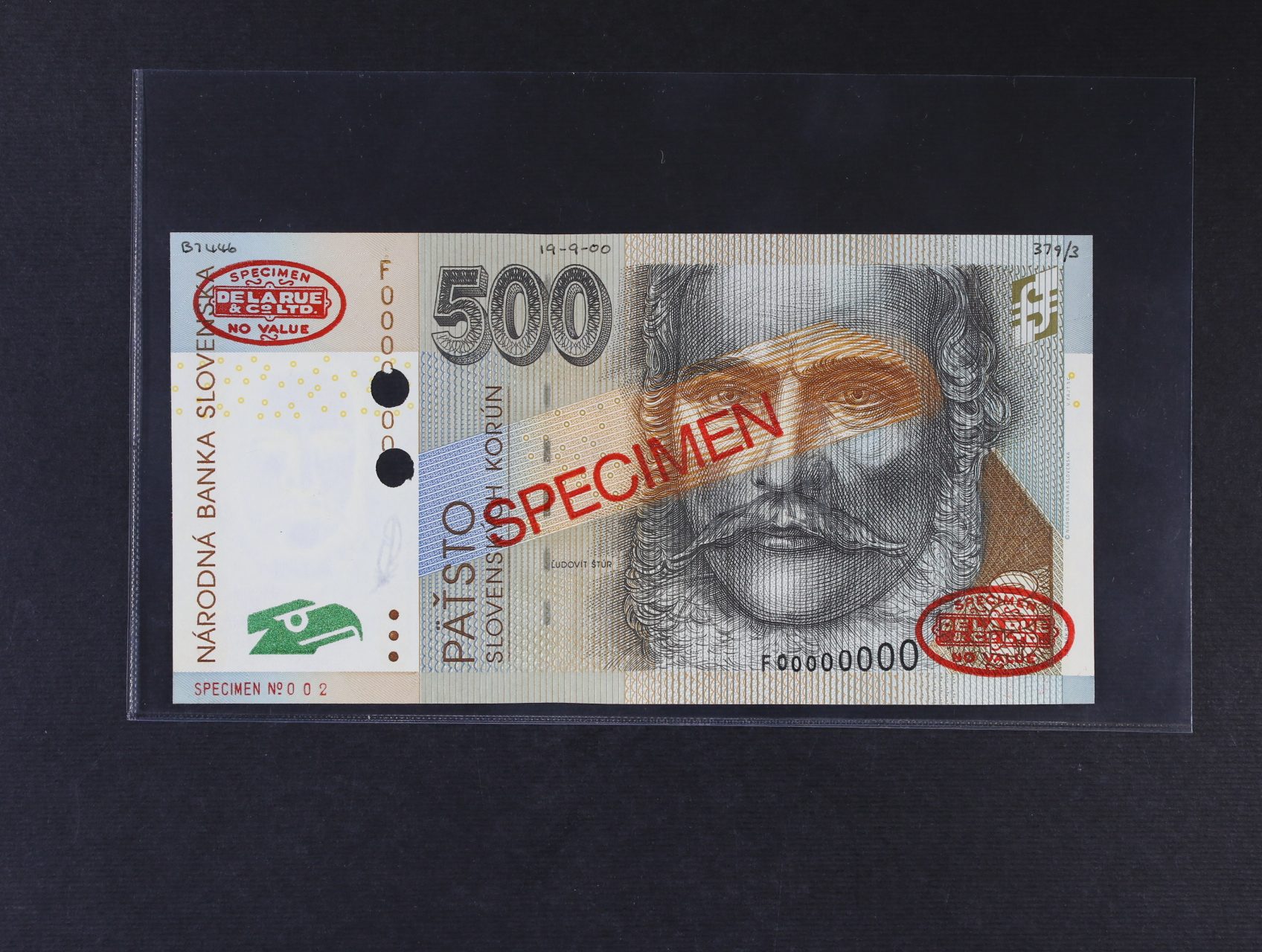 • 500 Sk 20.10.2000 série F anulát s přetiskem SPECIMEN + 2x pečeť De La Rue + 2x perf. otvor, specimen č. 002, evidenční čísla v okraji, doposud známé pouze 3 kusy, Ba. SK 27s, Pi. 31, mimořádně vzácné