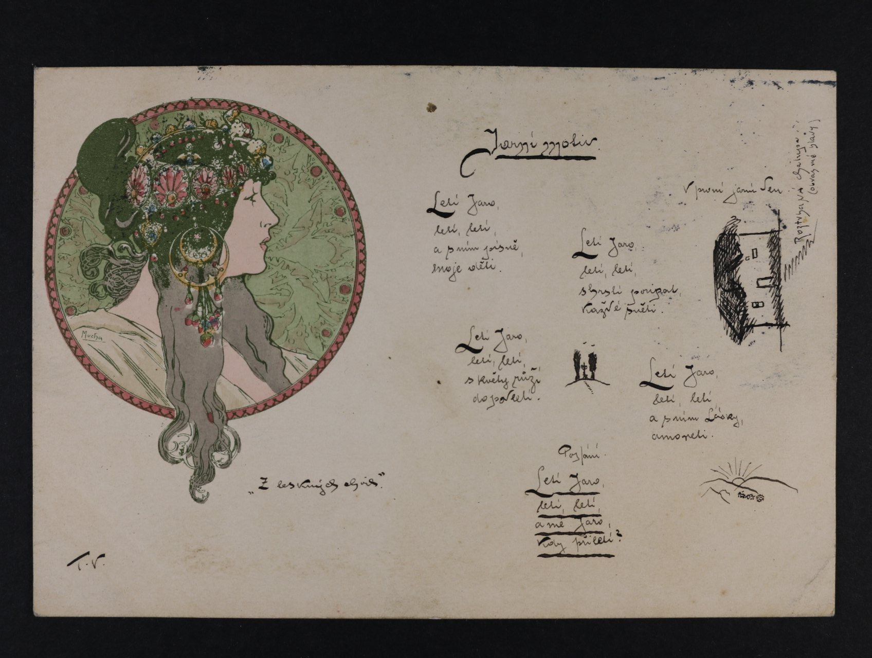 A. Mucha - bar. litograf., franc. vydání, dl. adresa, použitá v r. 1900, v pravém dolním rohu lom