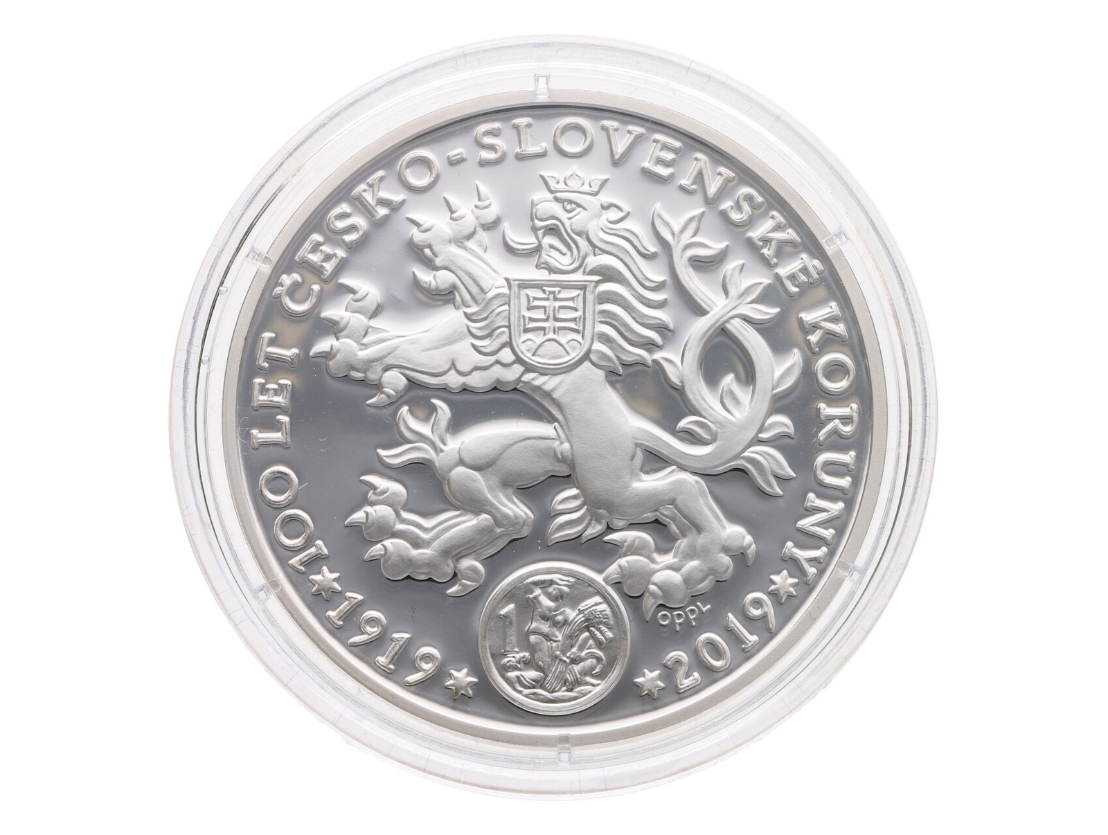 Ag medaile ČNB "100 LET KČ" 1919 - 2019, Ag 0,999, 50g, motiv 100.000.000 Kč vzoru 2019, certifikát, etue