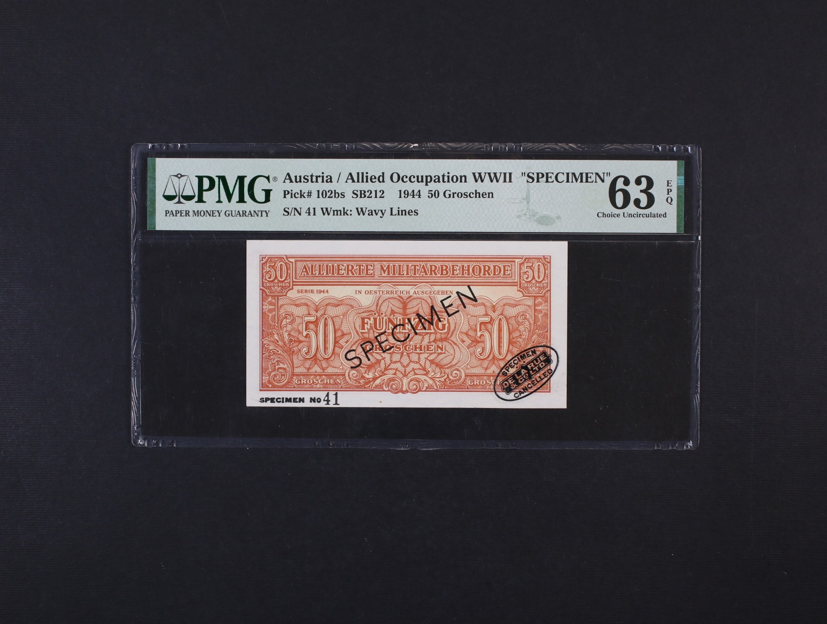 Alliierte, 50 Groschen 1944, SPECIMEN No. 41, pečeť De La Rue, Ri. 253b1, PMG 63