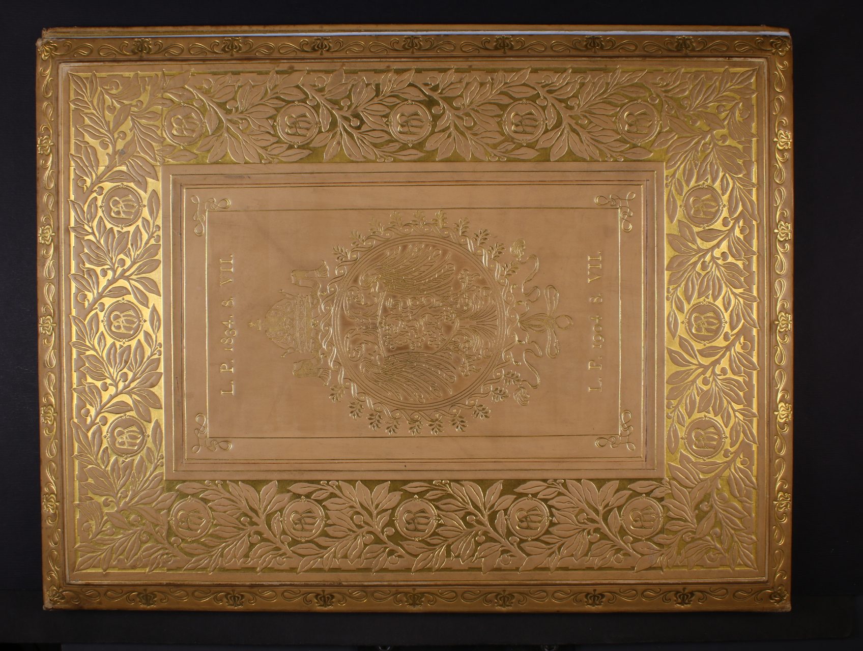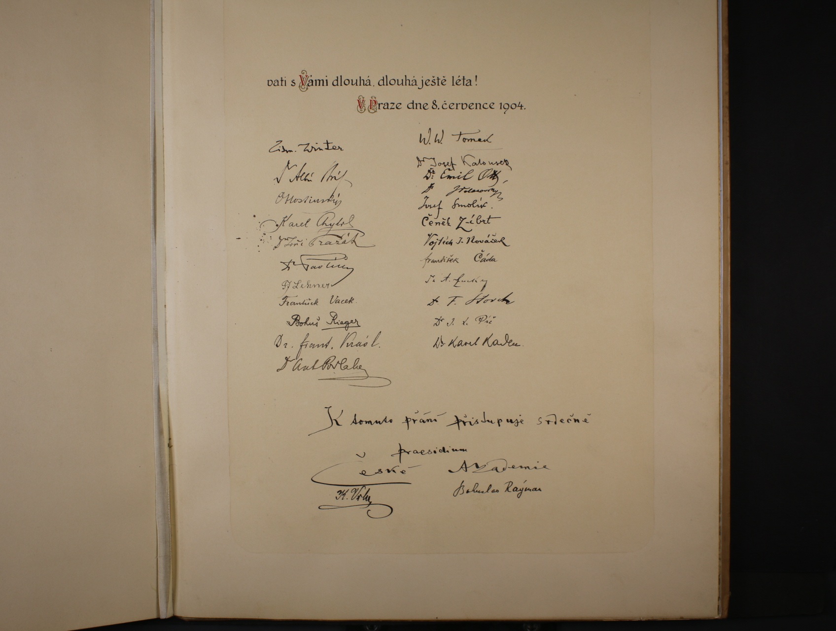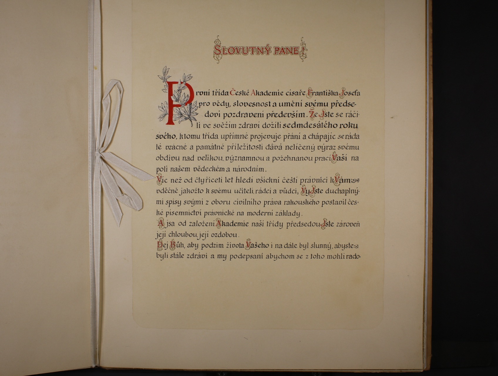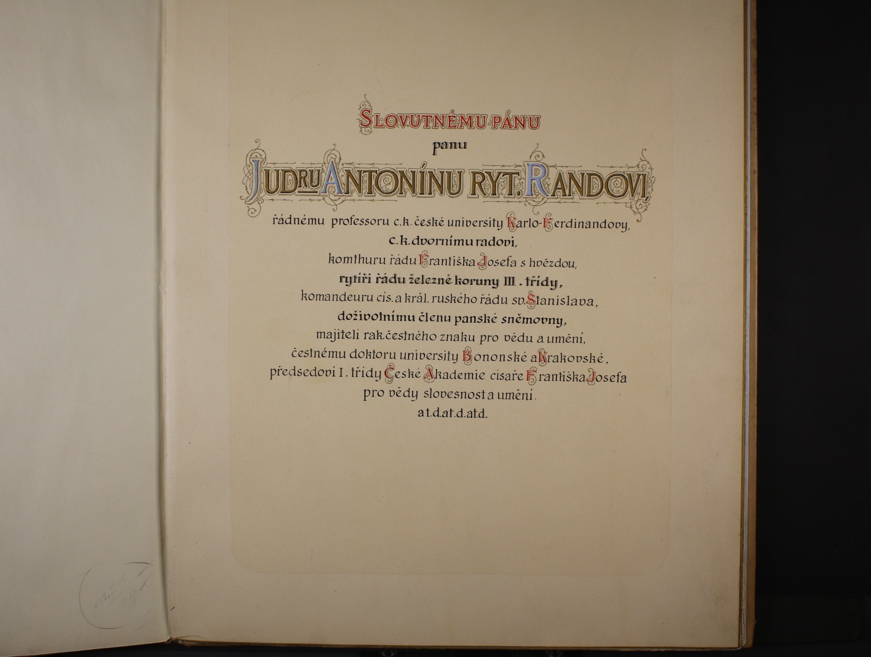 Blahopřání k sedmdesátým narozeninám Slovutnému pánu, panu JUDRU ANTONÍNU RYT. RANDOVI, řádnému prof. C.K. české university Karlo-Ferdinandovy, c.k. dvornímu radovi, komthuru řádu Františka Josefa s hvězdou, rytíři řádu železné koruny III. tř., komandeuru cís. a král. ruského řádu sv. Stanislava, doživotnímu členu panské sněmovny, majiteli rak. čestného znaku pro vědu aumění, čestnému doktoru university Bononské a Krakovské ... odm přátel a presidia České Akademie s podpisy mj. Zikmund Winter, Otakar Hostinský, Bohuslav Rieger, Antonín Podlaha, Emil Ott, Dr. F. Štorch, s datací 8. července 1904, vše vyvázané v luxusních reliéfních zlacených kožených deskách, mimořádné, dekorativní