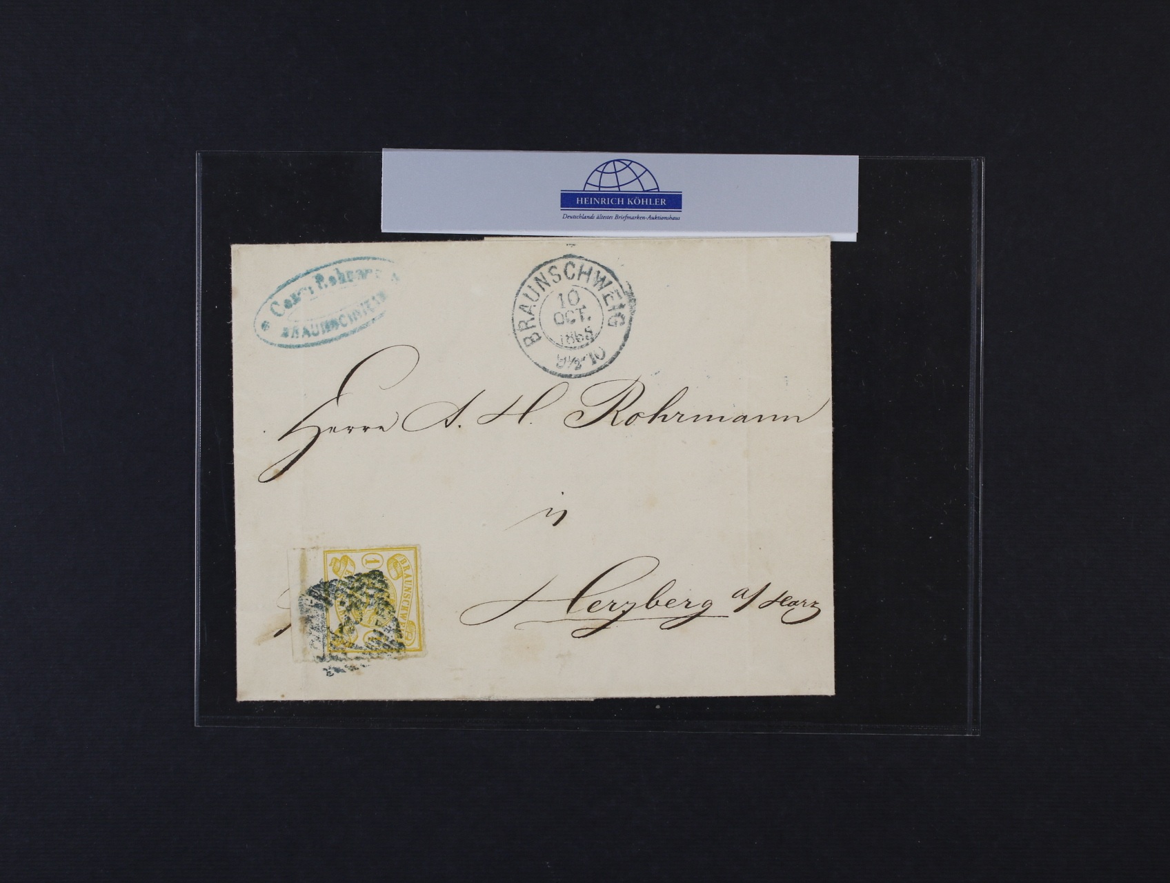 Braunschweig - skl. dopis z r. 1865 frank. zn. Mi. č.14 A s průsekem a spodním okrajem (6 mm) znehodnoc. čís. raz. 8 + DR BRAUNSCHWEIG 10.OCT.1865, na zadní str. přích. rámeč. raz.. ve spodní části dopisu lehký vodorovný lom, atest Dr. Hans Wilderbeek, velmi dekorativní, zajímavý dopis