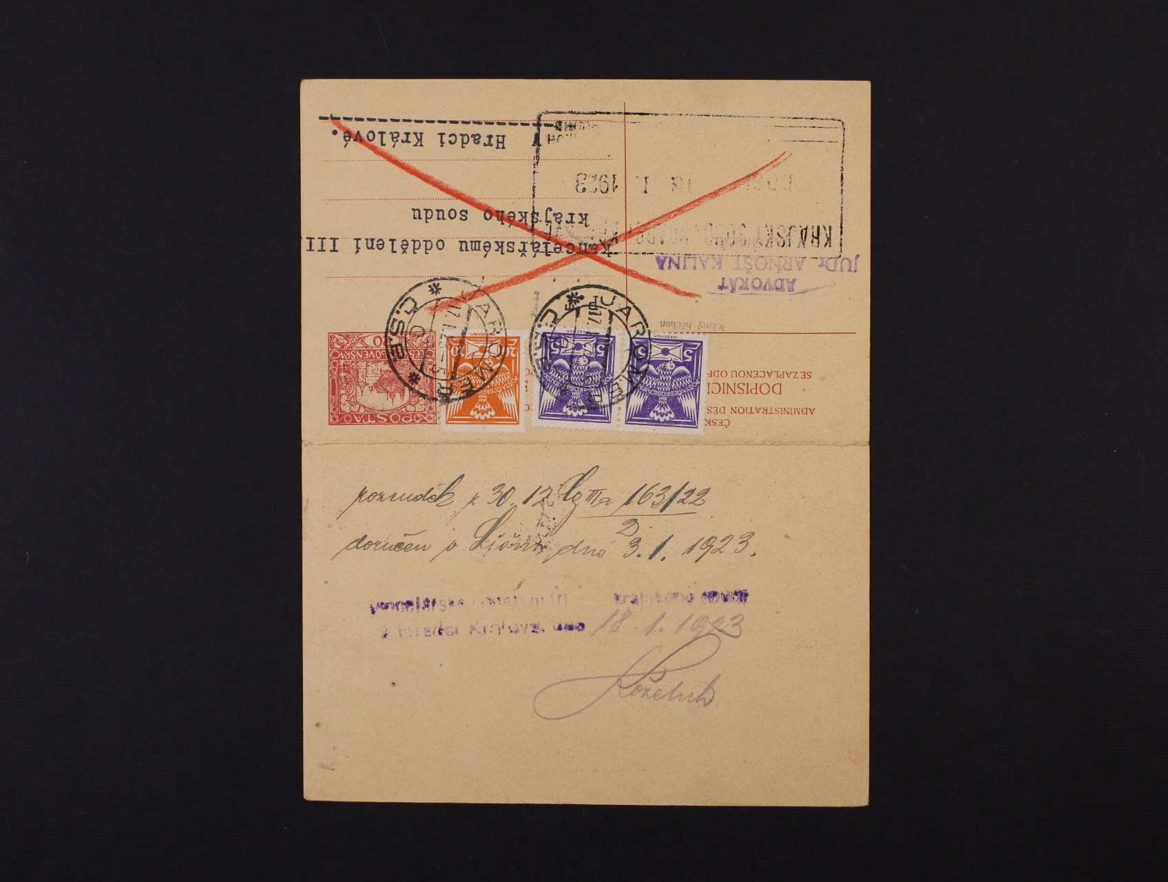 CDV č. 21 dvojitá nerozřezaná, oboustr. použitá, dofrank. zn. č. 144 C, ležmý hřeben, ve dvoupásce a zn. č. 148, pod. raz. na I. části HRADEC KRÁLOVÉ 18.1.23, na druhé části JAROMĚŘ 17.1.23, velmi zajímavá a vzácná kombinace, zk. Karásek