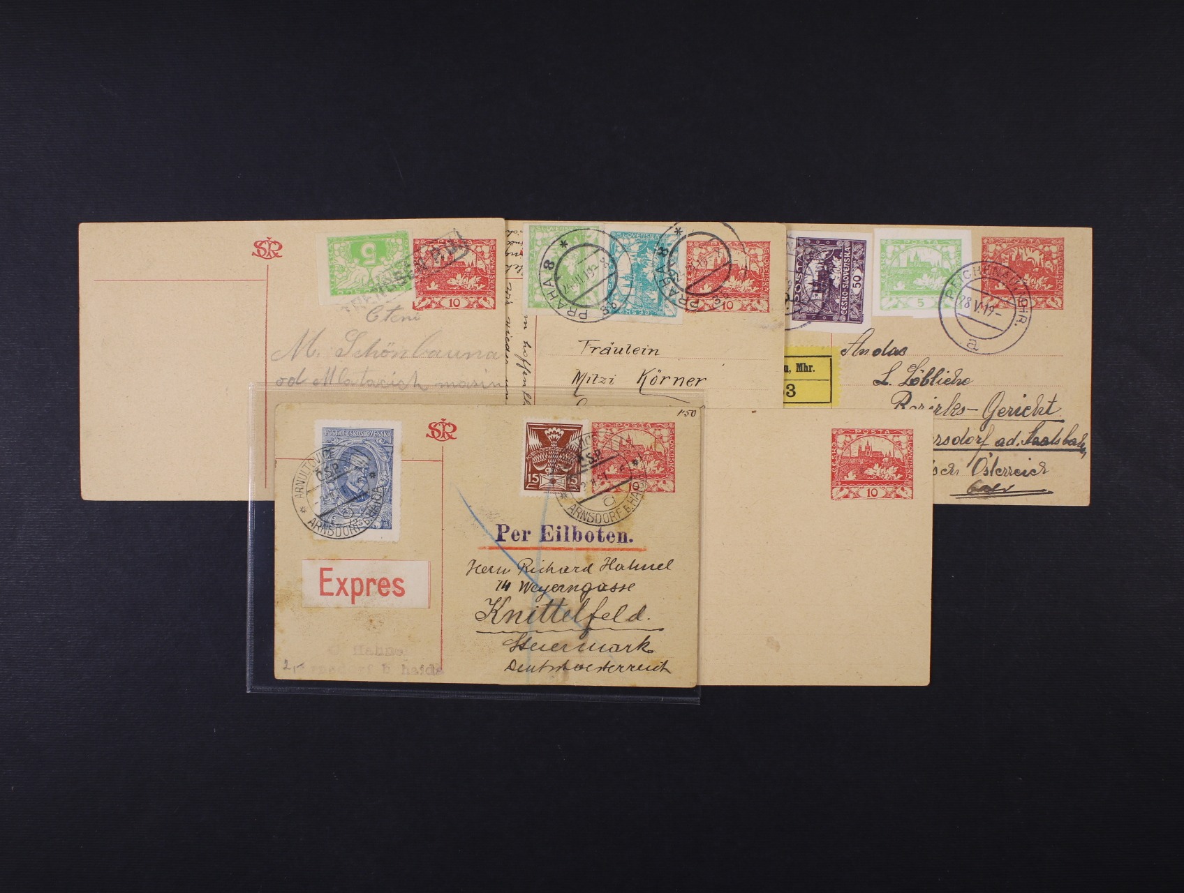 CDV č. 7 - sestava 5 ks, 1x nepoužitá, 1x dofrank. zn. S2 s rámeč. raz. TRENCSEN P.U., 2x RECO do Rakouska dofrank. zn. Hradčan, 1x EXPRES do Rakouska dfrank. zn. č. 140 a 147, pod. raz. ARNOULTOVICE 21.7.21, zajímavá sestava, zajímavá raz.