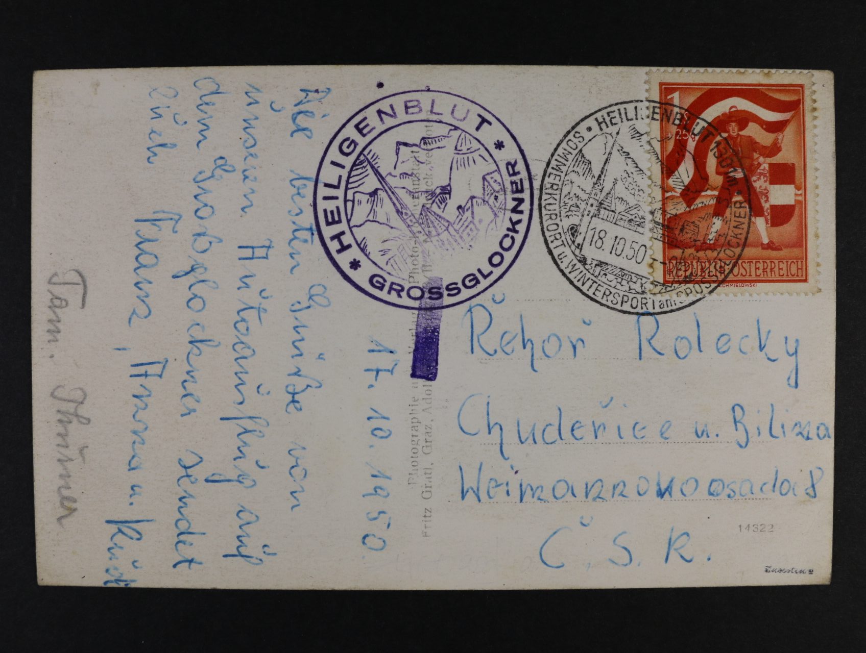 celistvost frank. zn. Mi. č. 953 s podacím pam. raz. SOMMERKURORT u. WINTERSPORT ...HEILIGEN BLUT 1301 m 18.10.50
