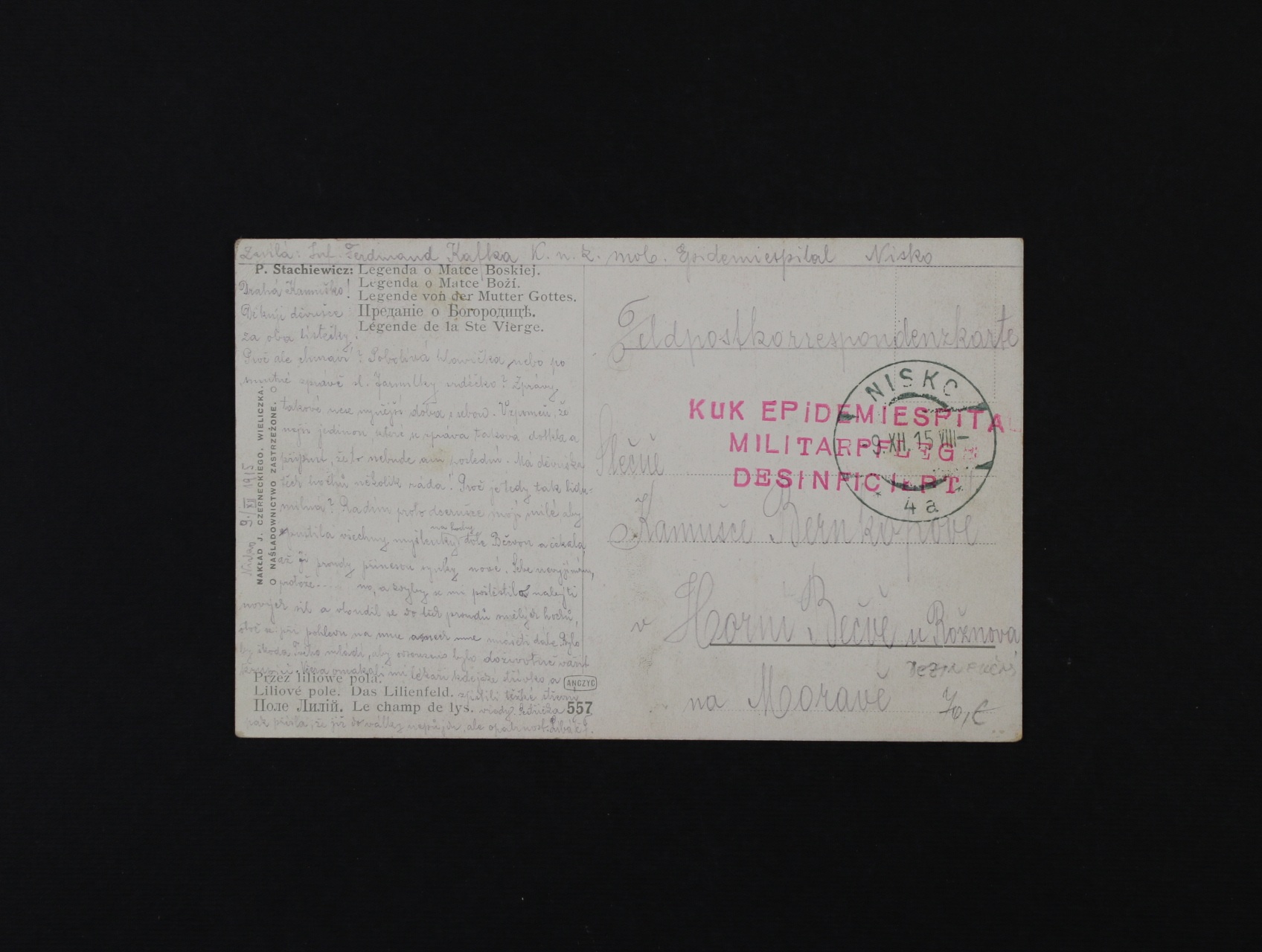 • celistvost na Moravu s pod. raz. NISKO 9.12.15 + přídavné řádk. fialové raz. K.U.K. EPIDEMIESPITAL MILITARPFLEGE DESINFICIIRT, zajímavé
