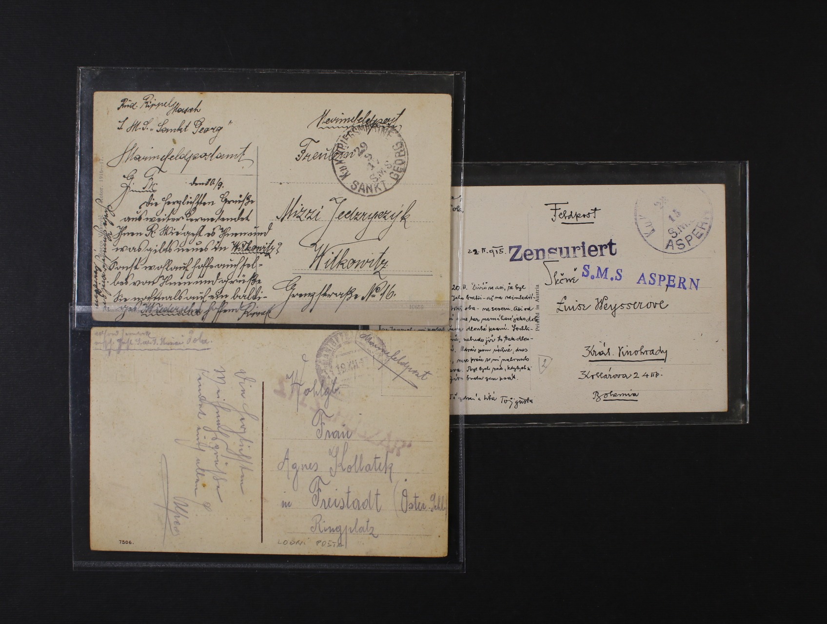 celistvost s pod. raz. K.u.K. KRIEGSMARINE S.M.S. ASPERN 28.2.15 + příd. řádk. raz. S.M.S. ASPERN, cenzura, dtto s pod. raz. K.u.K. KRIEGSMARINE POLA 19.12.17 + řádk. lodní raz. S.M.S. HUSZAR a dtto s lodním raz. S.M.S. SANKT GEORG 29.9.15, zajímavé