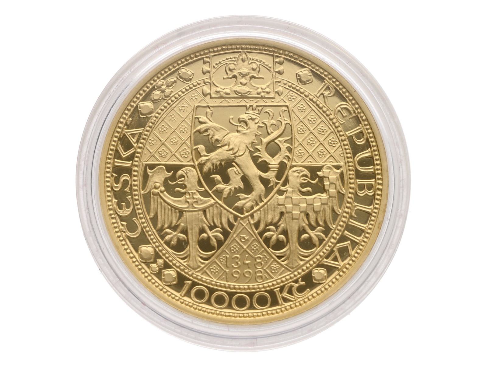 • Česká republika 1993 - 10.000 Kč 1998 mince Karla IV. - motiv Nové město pražské, náklad 1996 ks, 31,107g, Au 999/1000, etue, certifikát, kvalita PROOF, N ZCZ 8, Aur. C408