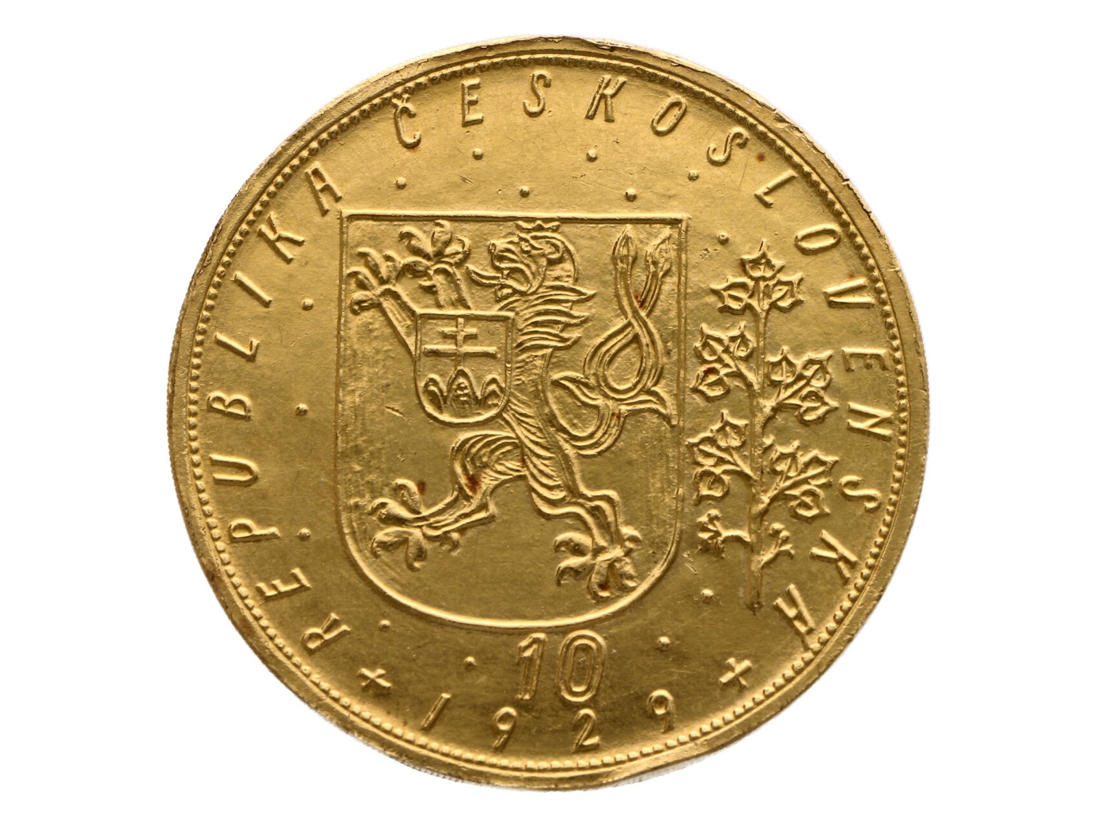 Československo 1918-1939 - 10 Dukát 1929, 34,90 g, Au 986/1000, raženo 1564 ks, N 19, Aur. 19, na A dr. hr., na R hrana
