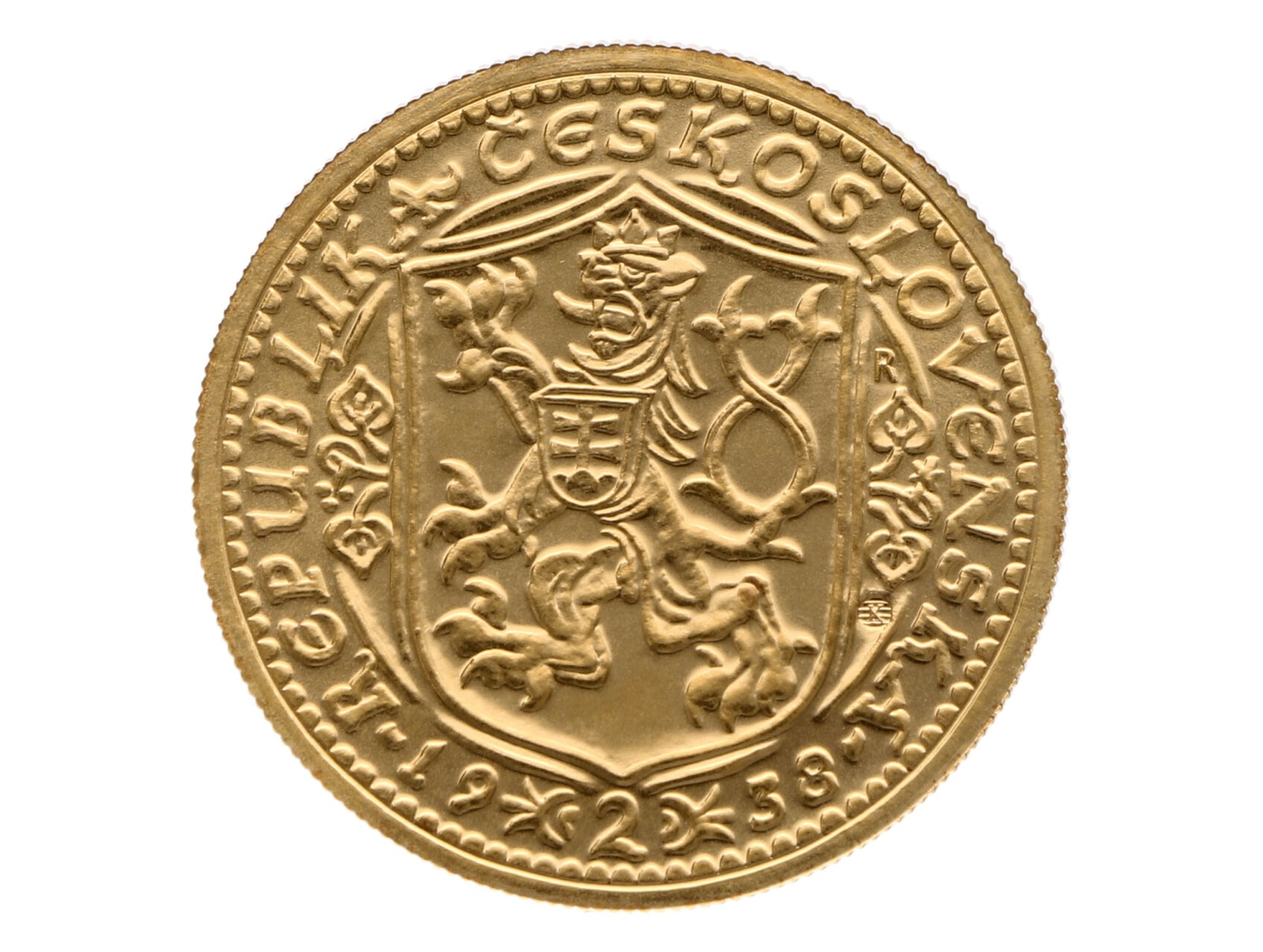 • Československo 1918-1939 - 2 Dukát 1938 novoražba z roku 2022, 6,98 g, Au 986/1000, raženo 120 ks, certifikát č. 115, Aur. N5c