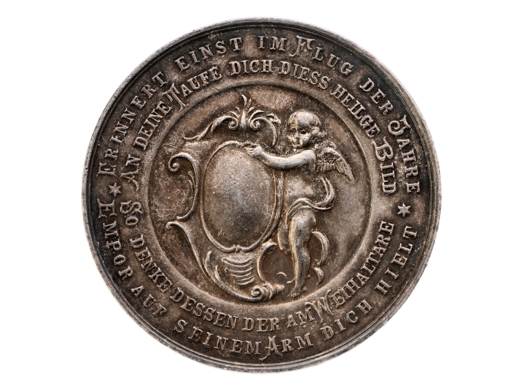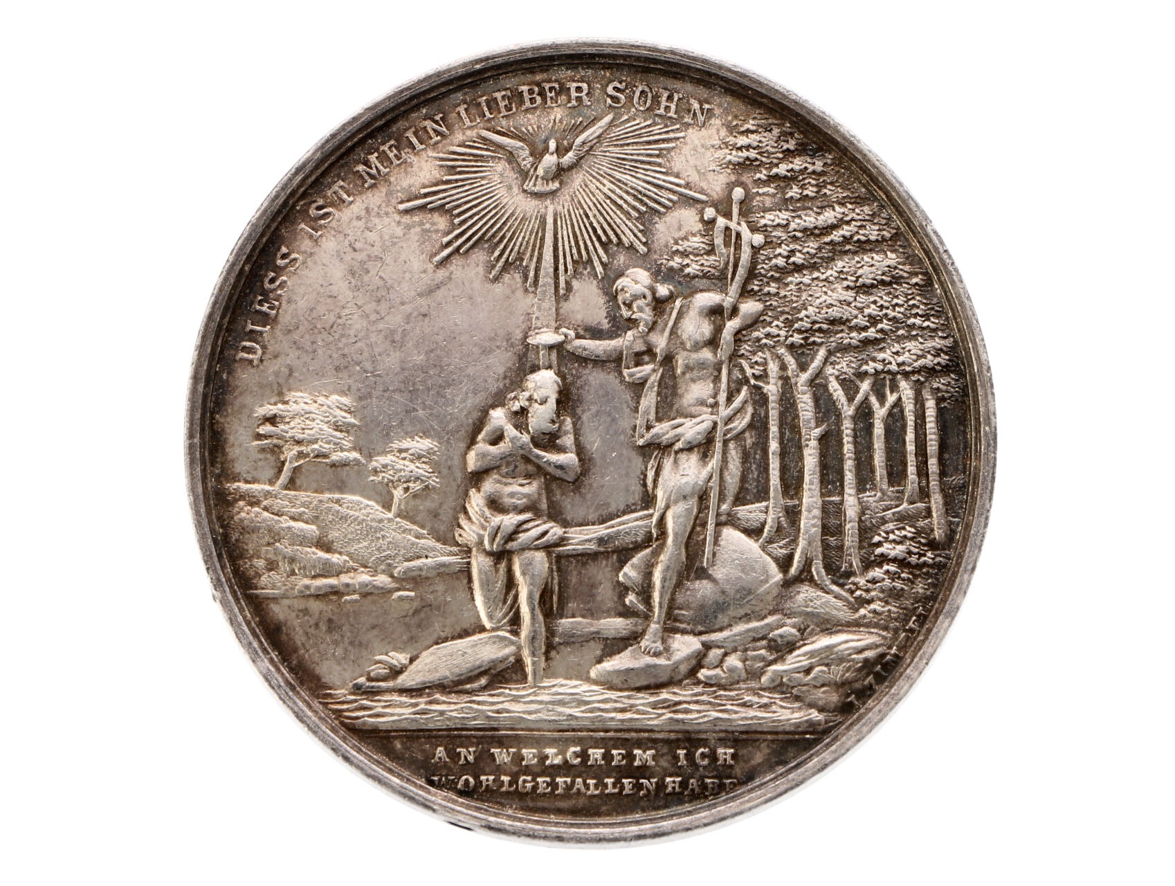 • Církevní - AR medaile na svatý křest. Stříbro průměr 40 mm, 24,13 g., na hraně punc Ag pro ryzost 900/1000 (hlava Diany 2 A), signováno L. Zimpel