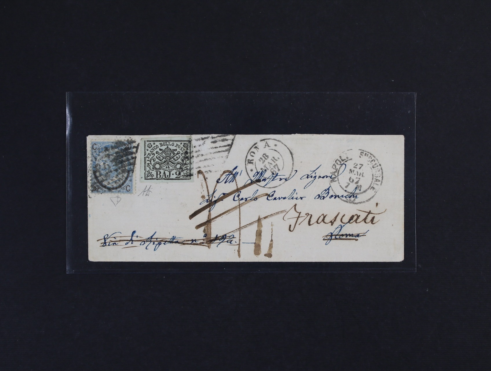 Církevní stát - dopis malého formátu z r. 1867 z Neapole do Říma a dále dosílaný do Frascati se smíš. frankaturou It. zn. Sas. č. 25, 15c, typ III + zn. Círk. státu Sas. č. 3, 2BAJ, pod. kosočtvercové linkové raz. + denní raz. NEAPOL.. 27.MAR.67 + průch. raz. ROMA 28.MAR.67 + přích. raz., v té době neexistovala žádná pošt. smouva mezi Itálií a Církevním státem, dopis byl vyfrankován pro poštovné z Říma do Frascati, jedná se o raritní kus, atest Enzo Diena, kat. Sas. 180000 EUR,