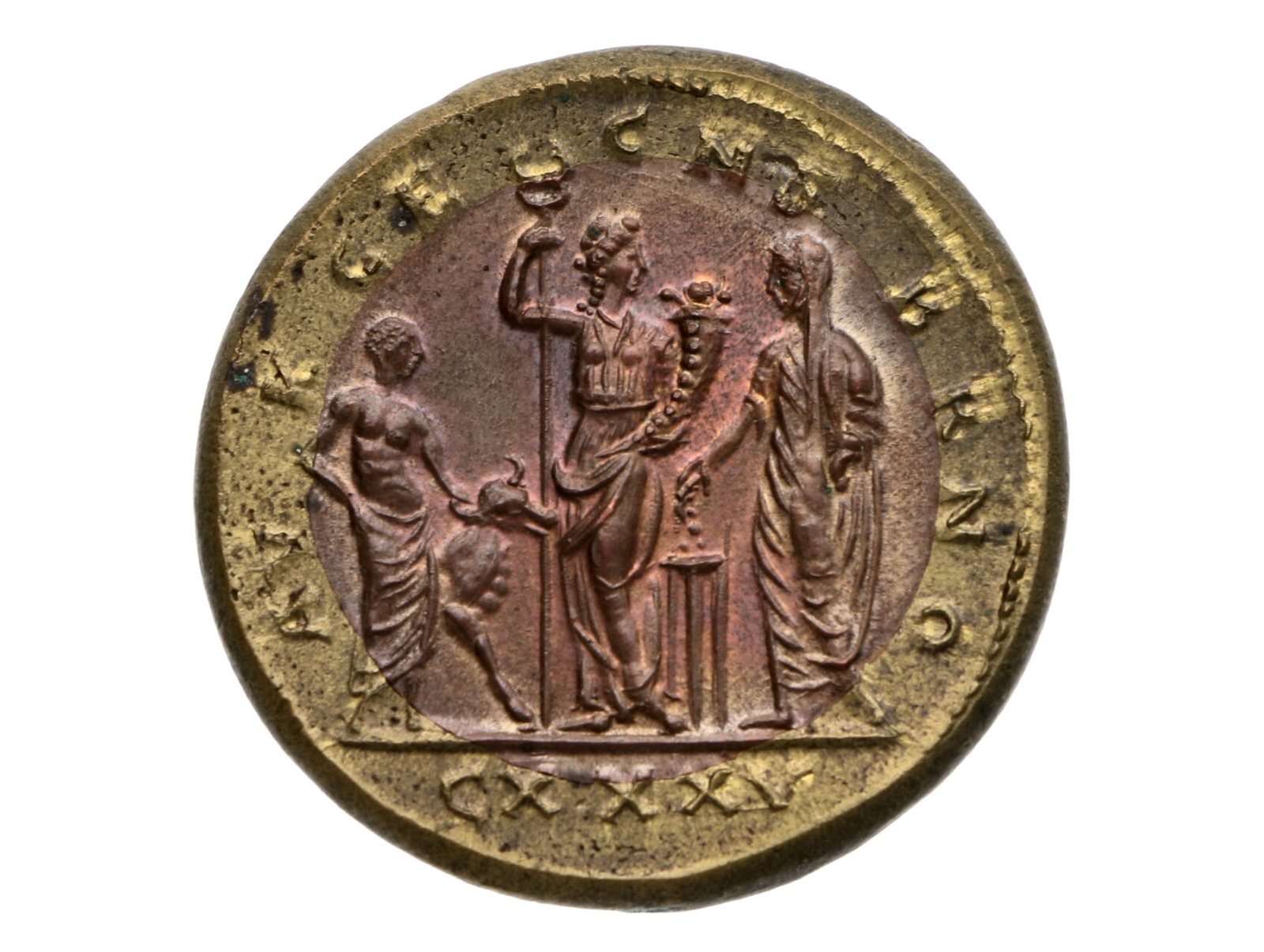 • ČNS - pobočka v Brně - AE medaile 135. aukce pobočky, 1997. Zmenšená napodobenina bimetalového medailonu císaře Commoda a Marcie. Bimetal,( mosaz, měď) 30 mm, 19,84 g., náklad 80 ks., nesignováno (P. Soušek)., F.A2/32b