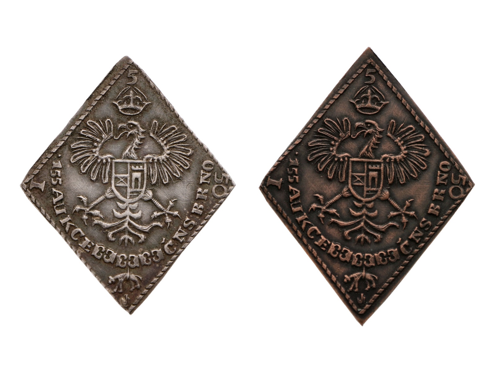 ČNS - pobočka v Brně - AR/AE medaile 155. aukce pobočky, 2008. Napodobenina rhomboidní medailky Ferdinanda I.. Stříbro 0.999, 30x25 mm, 2,89 g., náklad 119 ks., k tomu měděná, 3,36 g., náklad 93 ks., signováno JJ (J. Jelínek), F.A2/64b,c, celkem 2 kusy