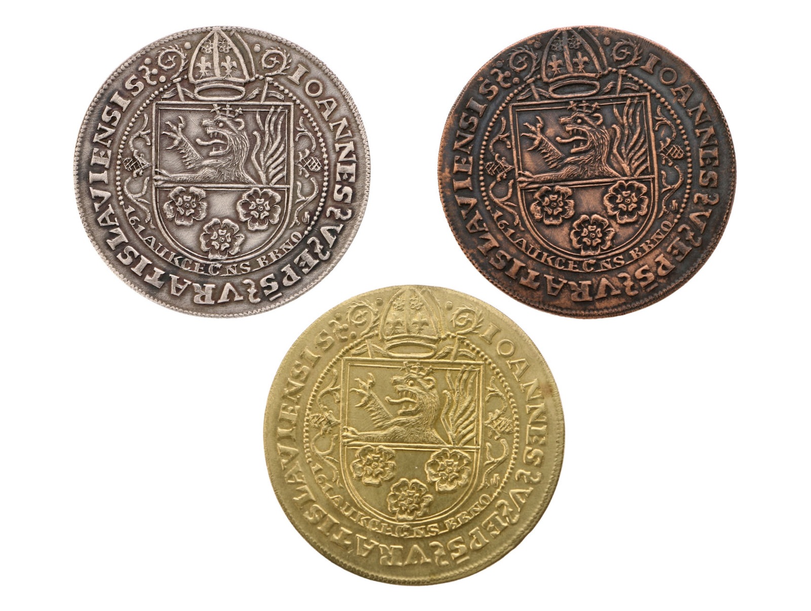 ČNS - pobočka v Brně - AR/AE medaile 161. aukce pobočky, 2011. Napodobenina tolaru vratislavského biskupa Jana V. Thursy z r. 1508. Stříbro 0,999, 36 mm, 14,91 g., náklad 85 ks., k tomu měď, 17,53 g., náklad 72 ks., a mosaz 15,64 g., náklad 35 ks., signováno JJ (J. Jelínek), F.A2/72b,c,d, celkem 3 kusy