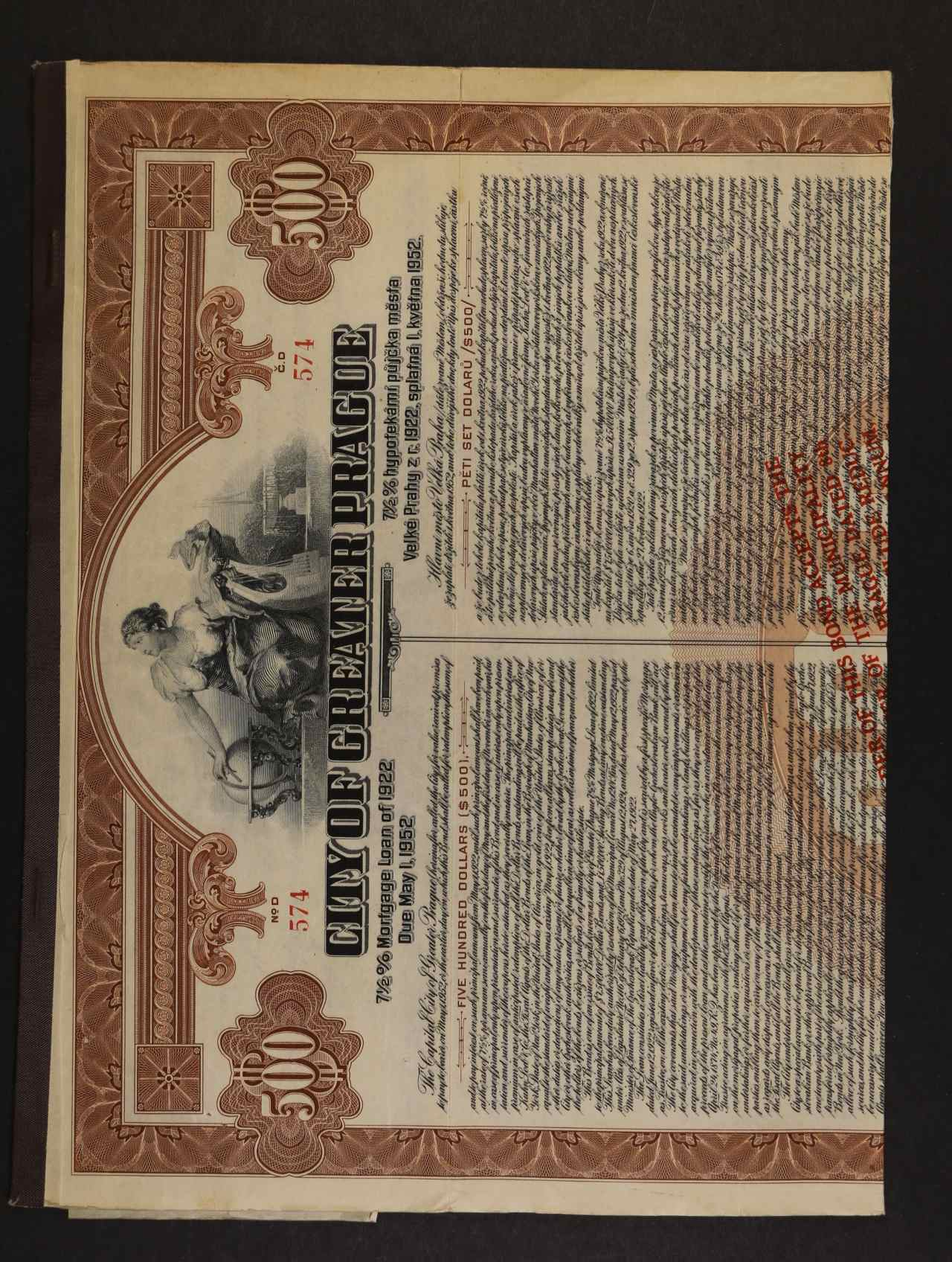 • ČSR, hypoteční půjčka města Velké Prahy 500 Dolarů z r. 1922 splatná 1.5.1952, včetně 5-ti kuponů, dekorativní