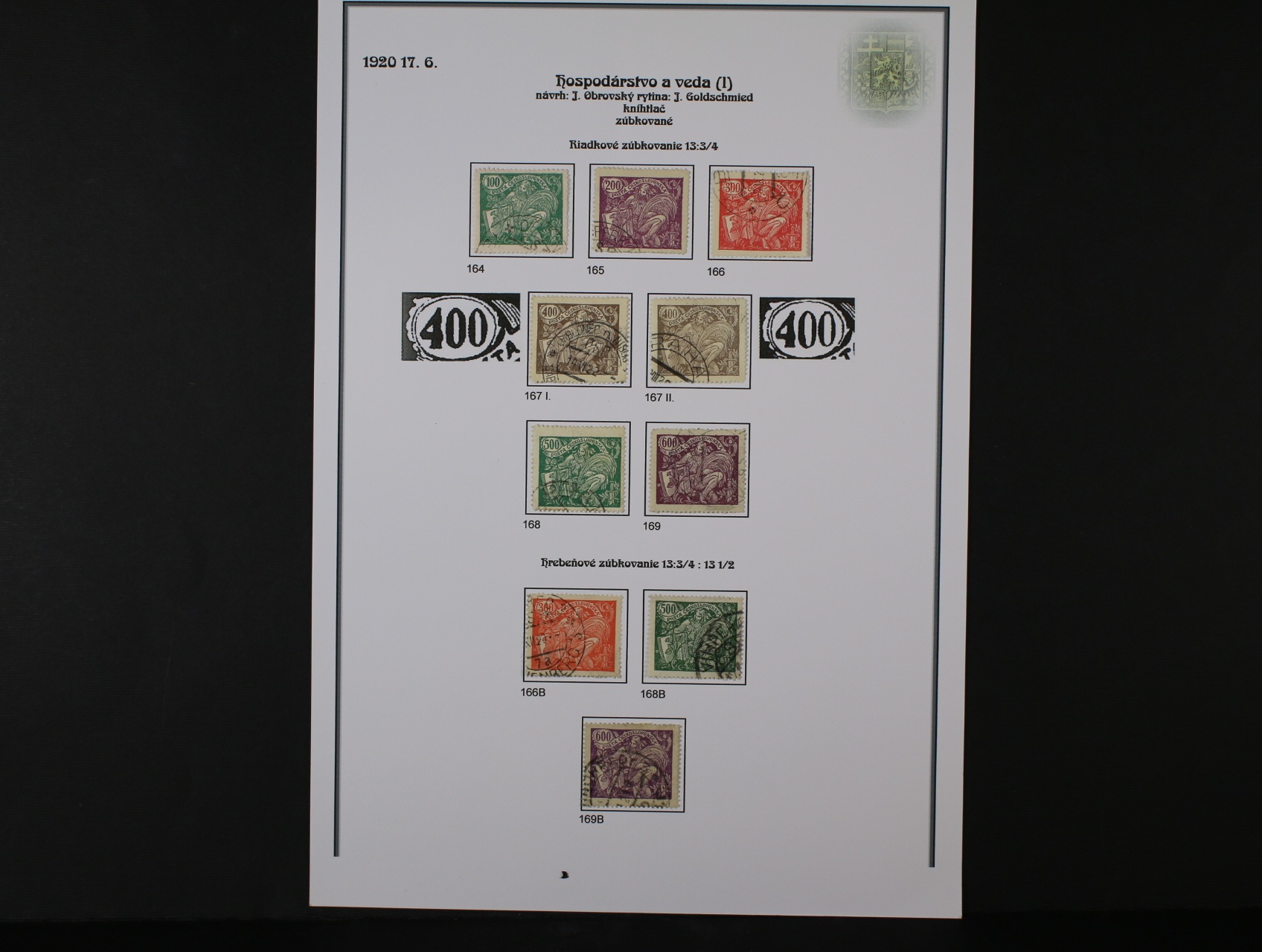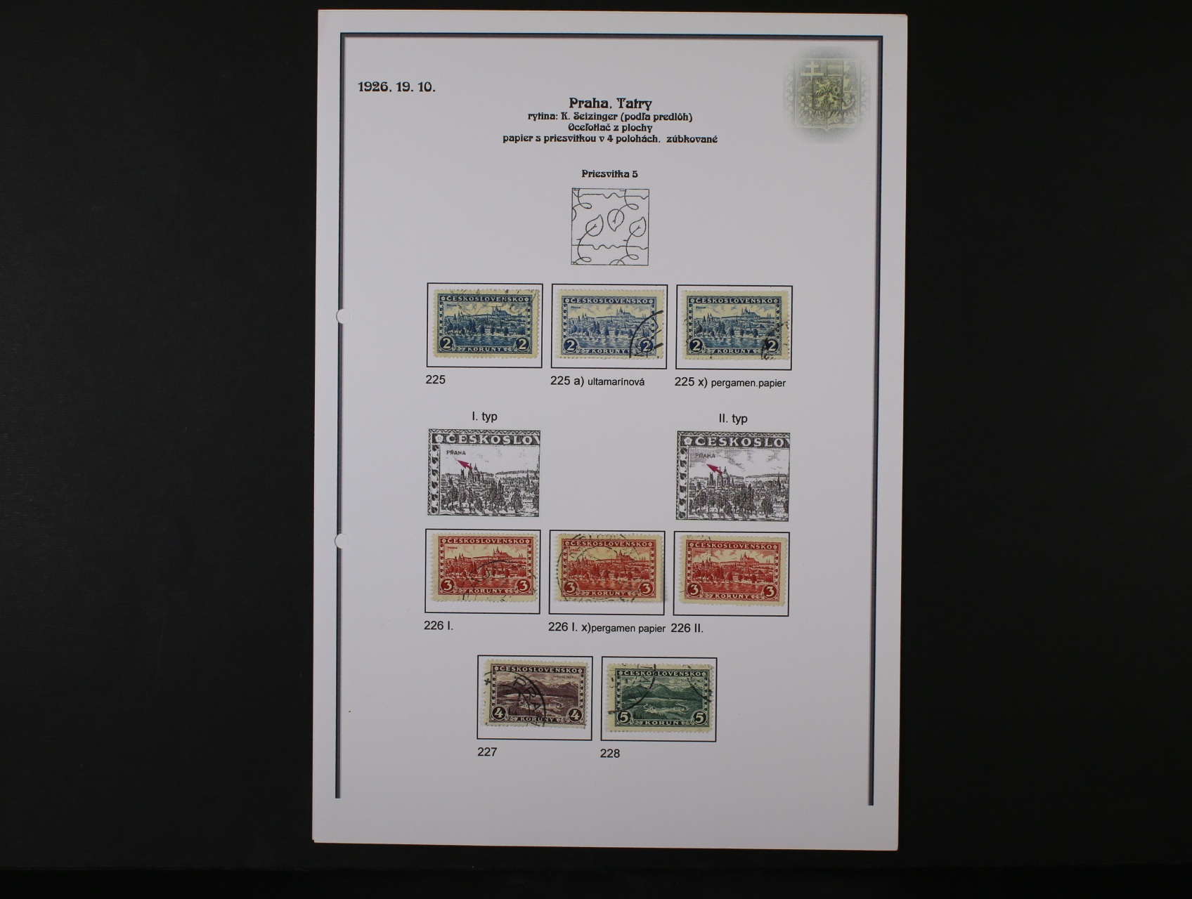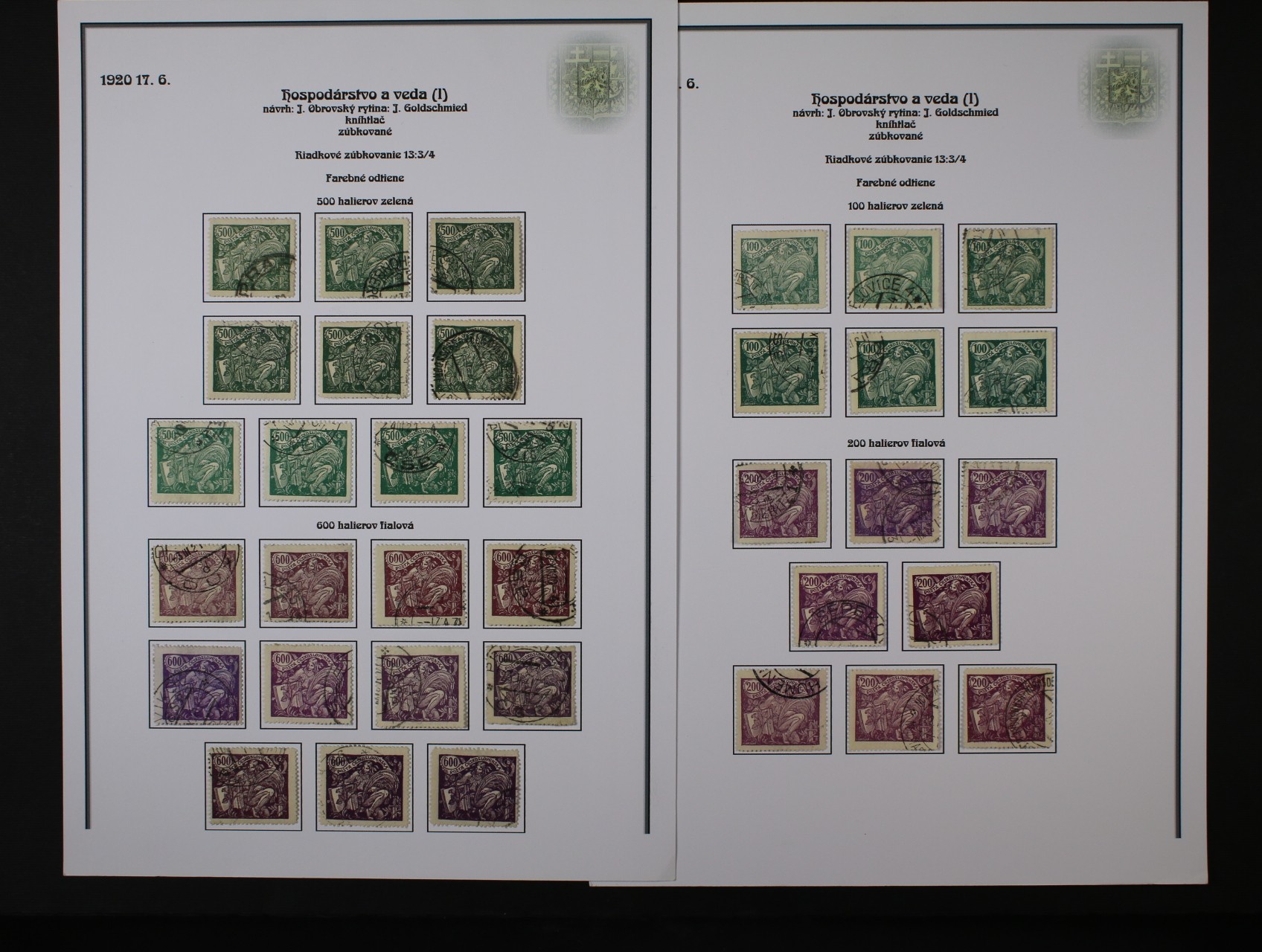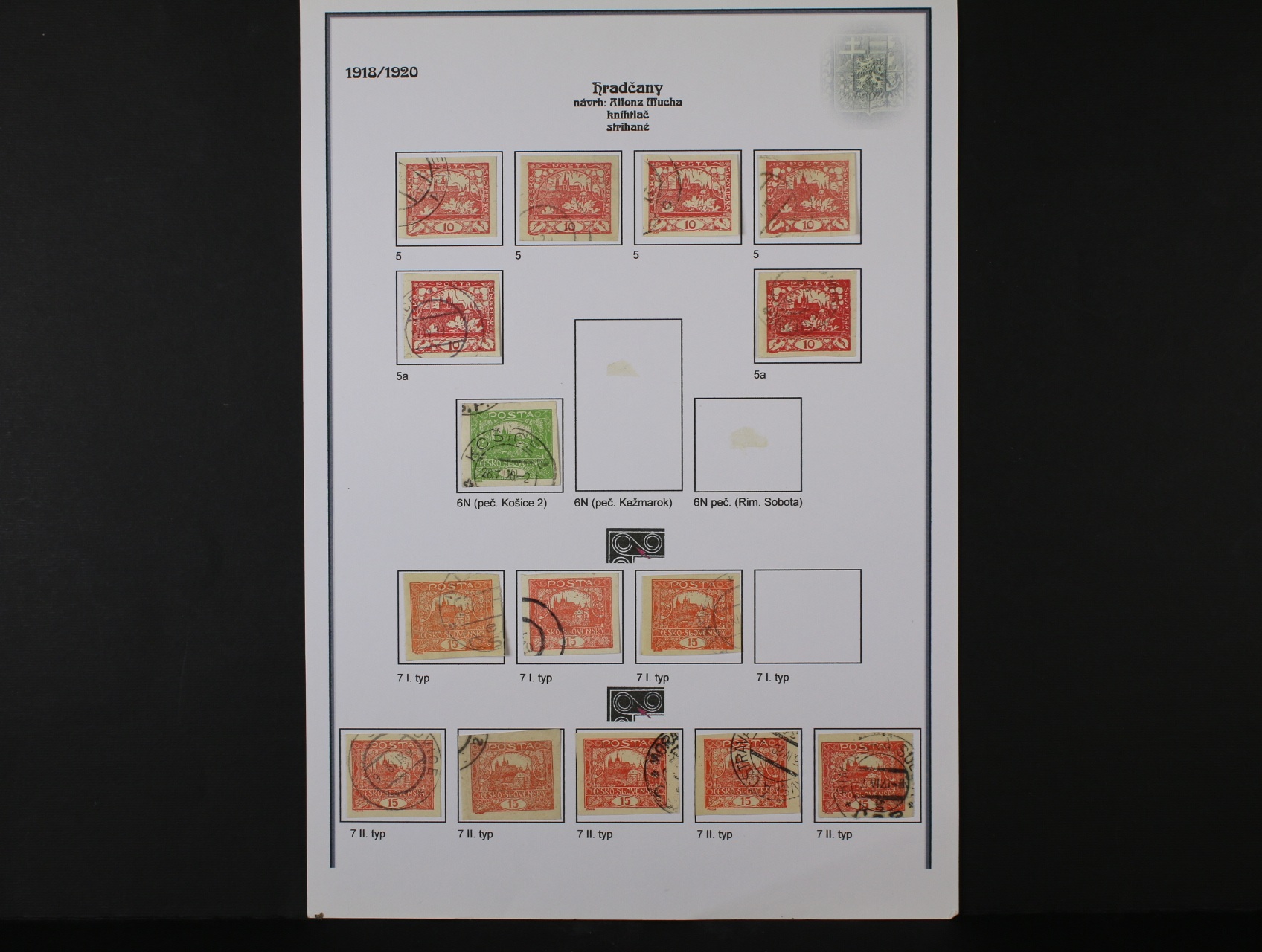ČSR I - rozsáhlá nekompl. specializovaná sbírka převážně razítkovaných zn. z let 1918 - 1939 se zaměřením na typy, barvy, DČ, DV, zoubkování, průsvitky, kupony, obsahuje mj. zn. č. 6 s raz. KOŠICE 28.7.20, zn. č. 18 I, 10c na výstřižku, 26a, 11 A II, 4 E, 7 E II. typ příčky, 7 G, 140a, typ I + II, 140 ST, 140 DV kratší příčka, 142 DV růže ve vlasech, uloženo na 110 listech s popisem, vys. kat. záznam