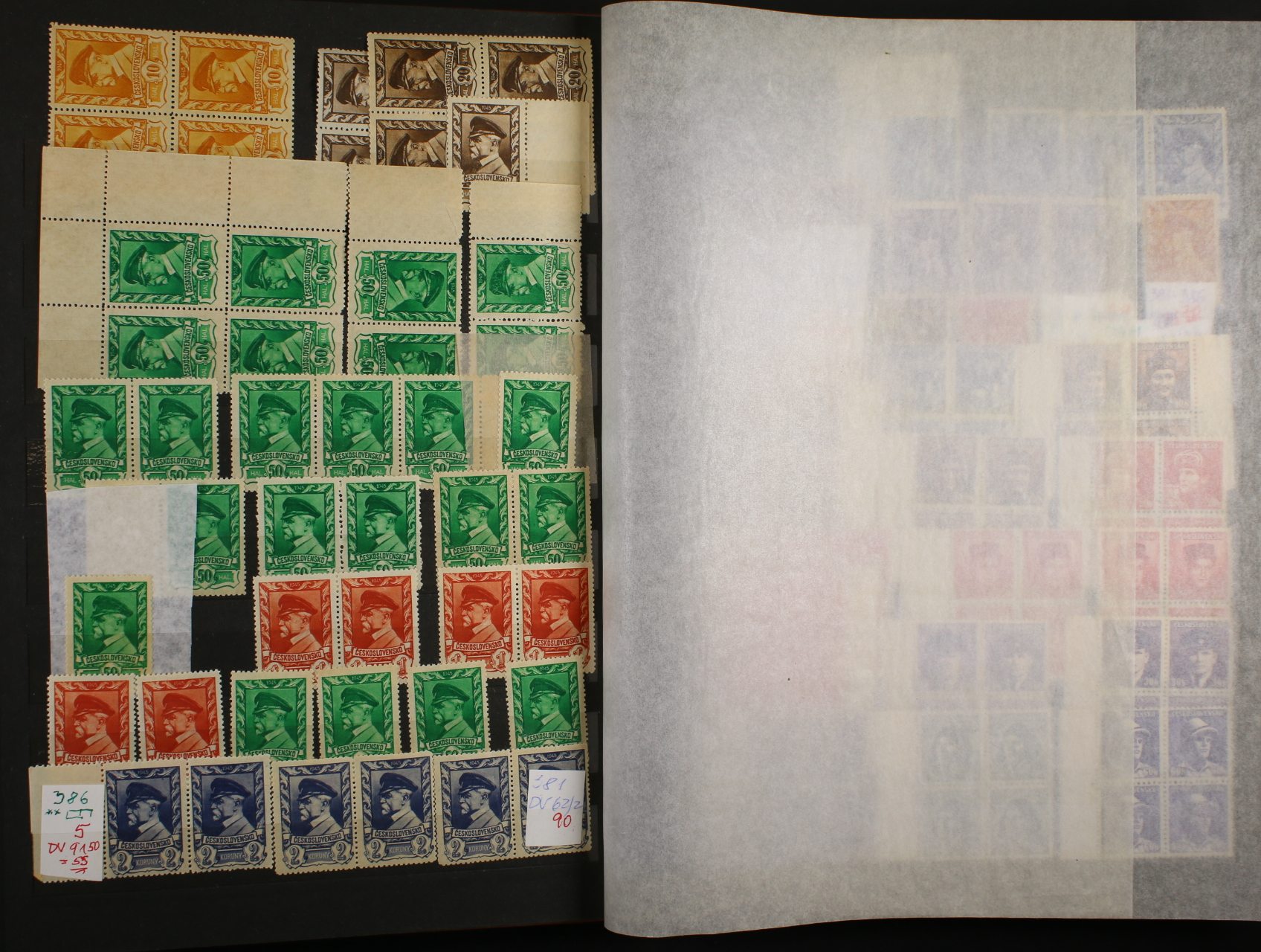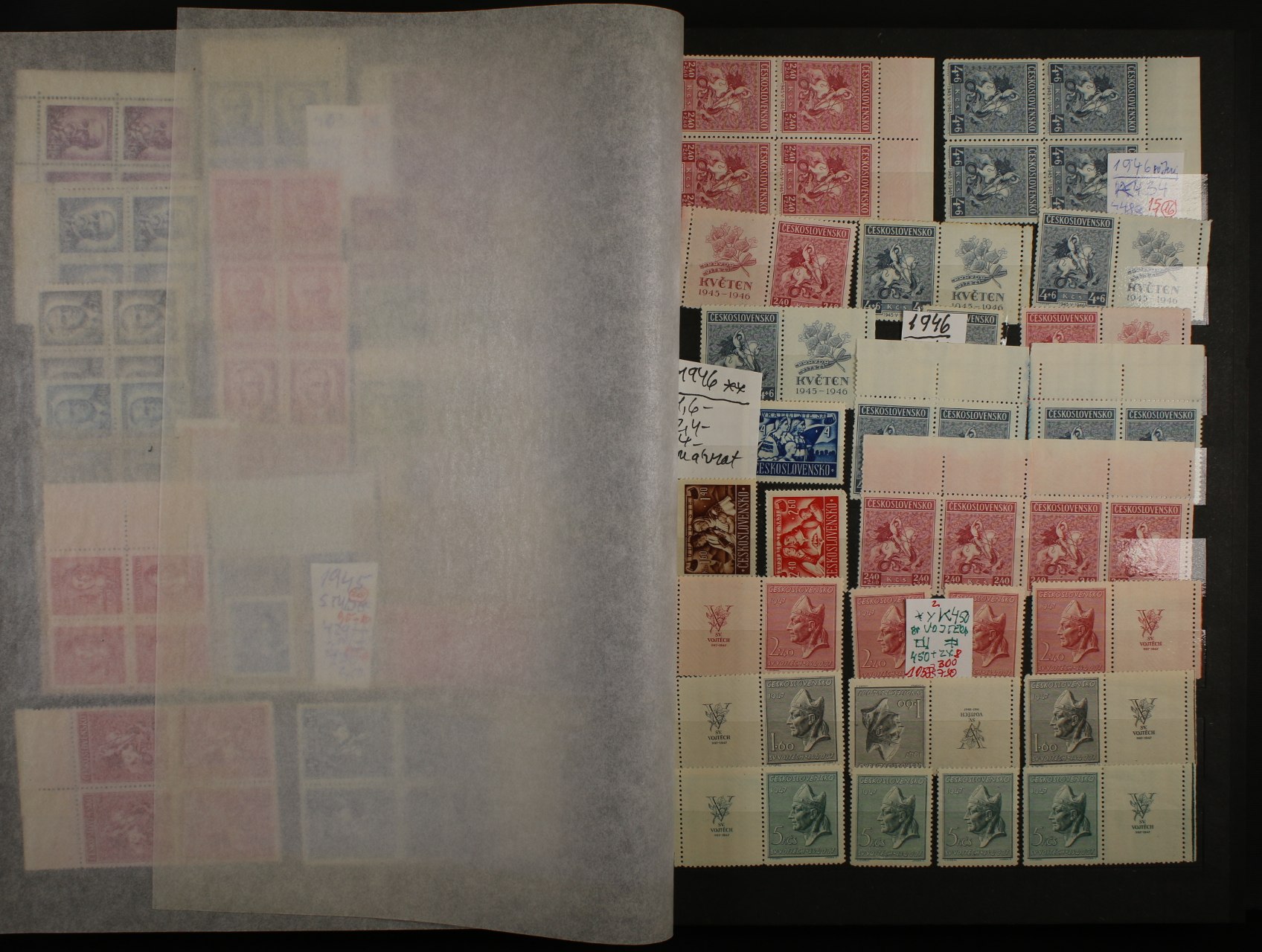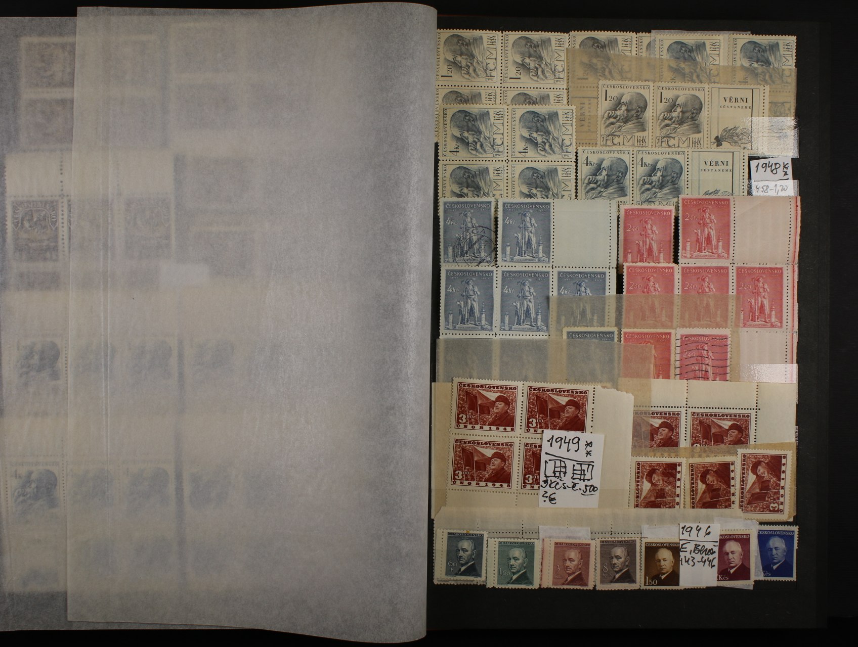 ČSR II - menší nekompl. sbírka zn. z let 1945 - 49, čtyřbloky a vícebloky, kupony, typy a DV, převážně svěží, mj. zn. č. 353 - 9, 450 KP + KL, kat. cena cca 8000 Kč, uloženo v hnědém zásobníku A4