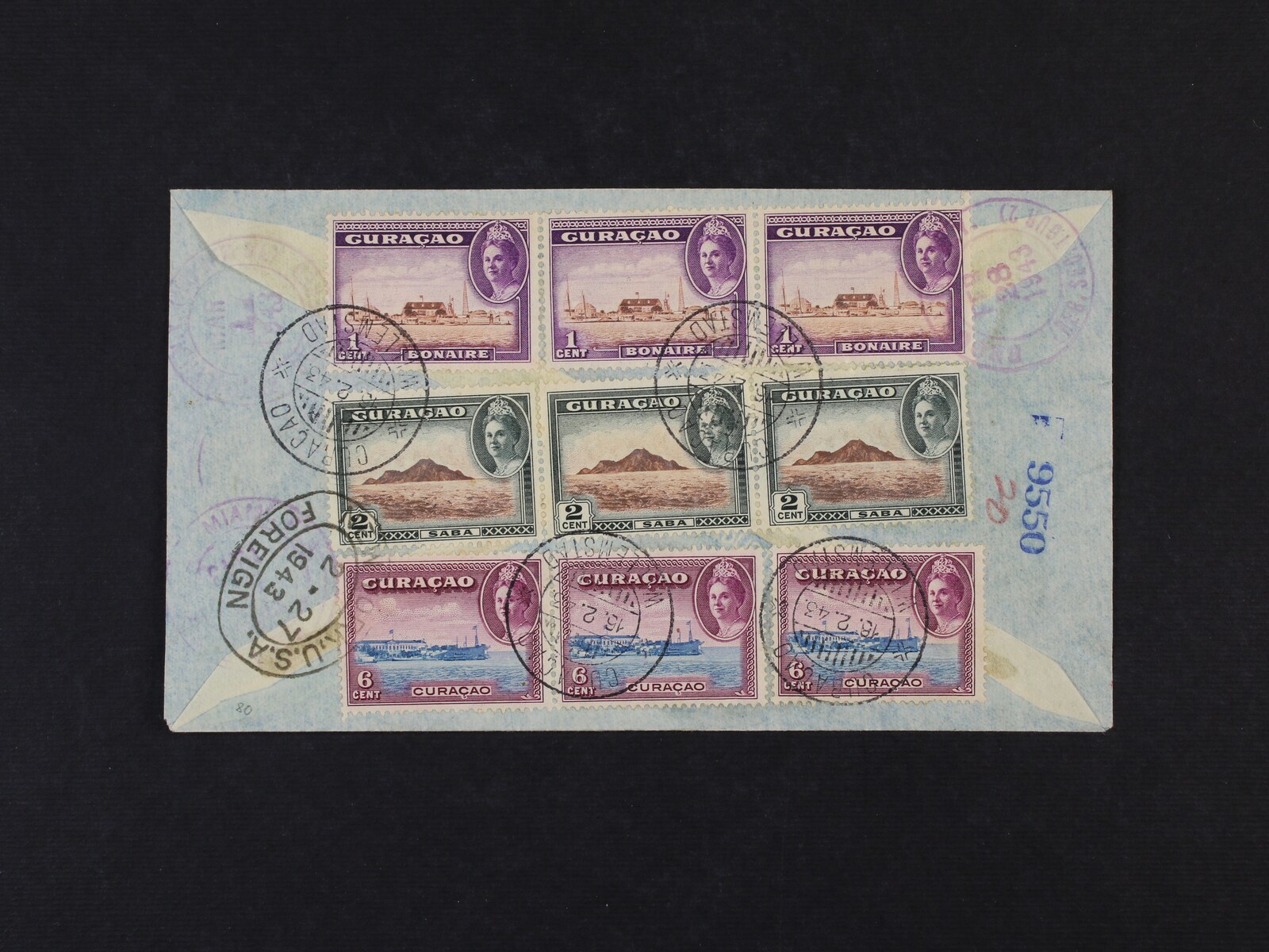 • Curacao - R-dopis do USA frank. pestrou násobnou frankaturou, pod. raz. CURACAO WILLEMSTAD 16.2.43 + průch. přích. a cenzurní raz.