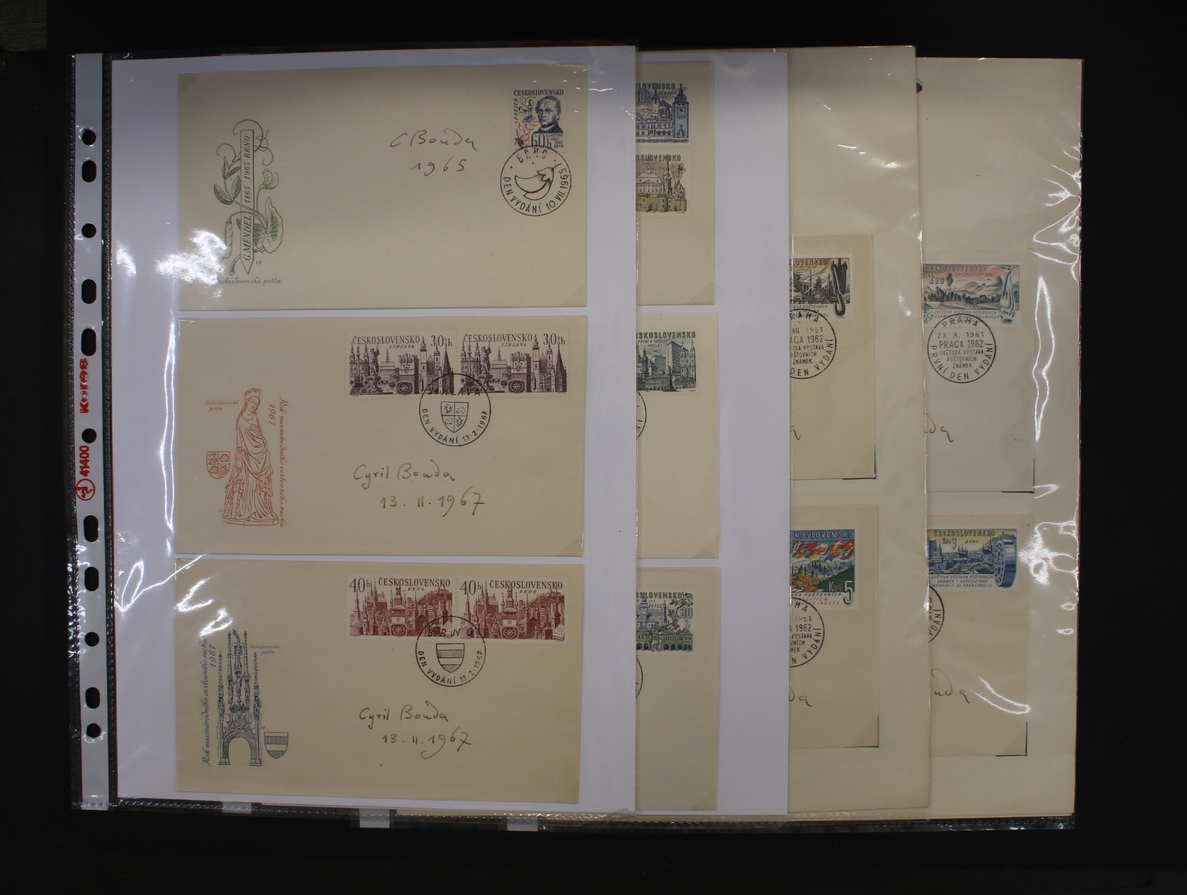 dárkové albíčko Min. dopravy a spojů k výstavě PRAGA 62, obsahuje mj. A č. 1216 TD B s podpisem autora C. Bouda, navíc obálky FDC se zn. č. 1206 - 1216 rovněž s podpisem C. Bouda, albíčko je rozloženo na jednotlivé listy v obalech, zajímavé