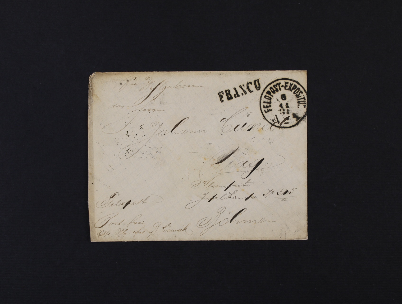 • dopis do Čech s pod. raz. FELDPOST - EXPOSITUR 6.11.81 + přídavné řádk. raz. FRANCO, na zadní str. průch. a přích. raz., zajímavé