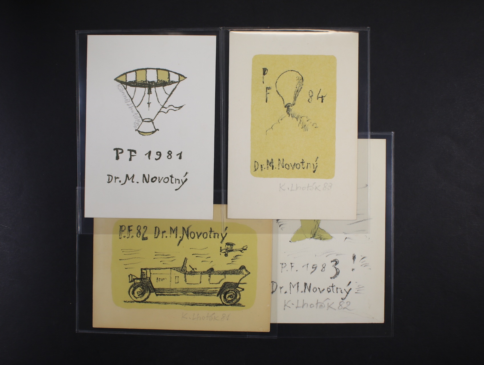 • Drobná grafika - sestava novoročenek z let 1981, 1982, 1983, 1984 s podpisem akad. malíře, grafika Kamila Lhotáka