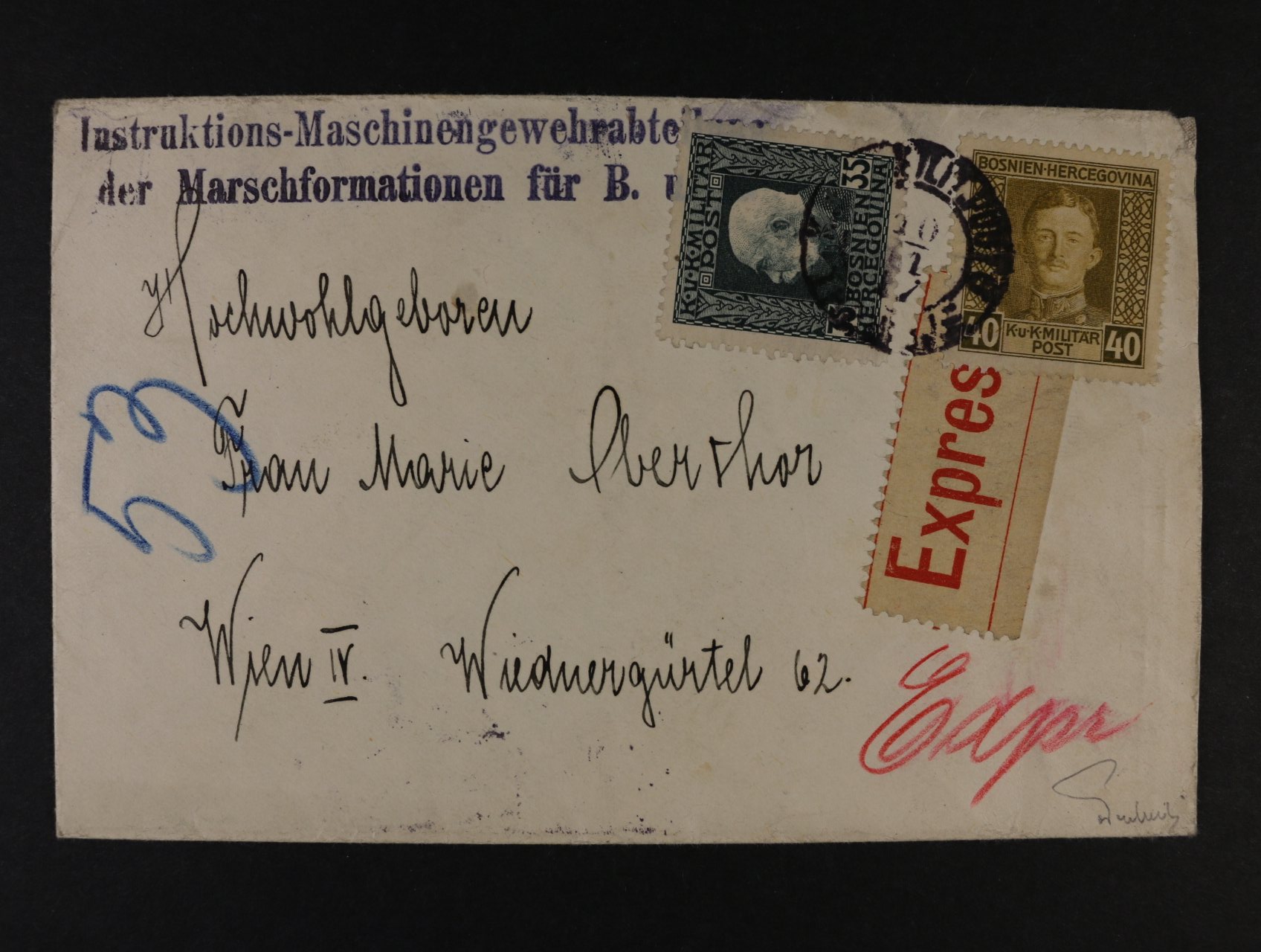 • EXPRES dopis do Vídně frank. smíš. frankaturou emisí 1912 a 1918 Fe. č. 35 + 133, pod. raz. TREBINJE, přích. raz., velmi vzácné, zk. Ferchenbauer