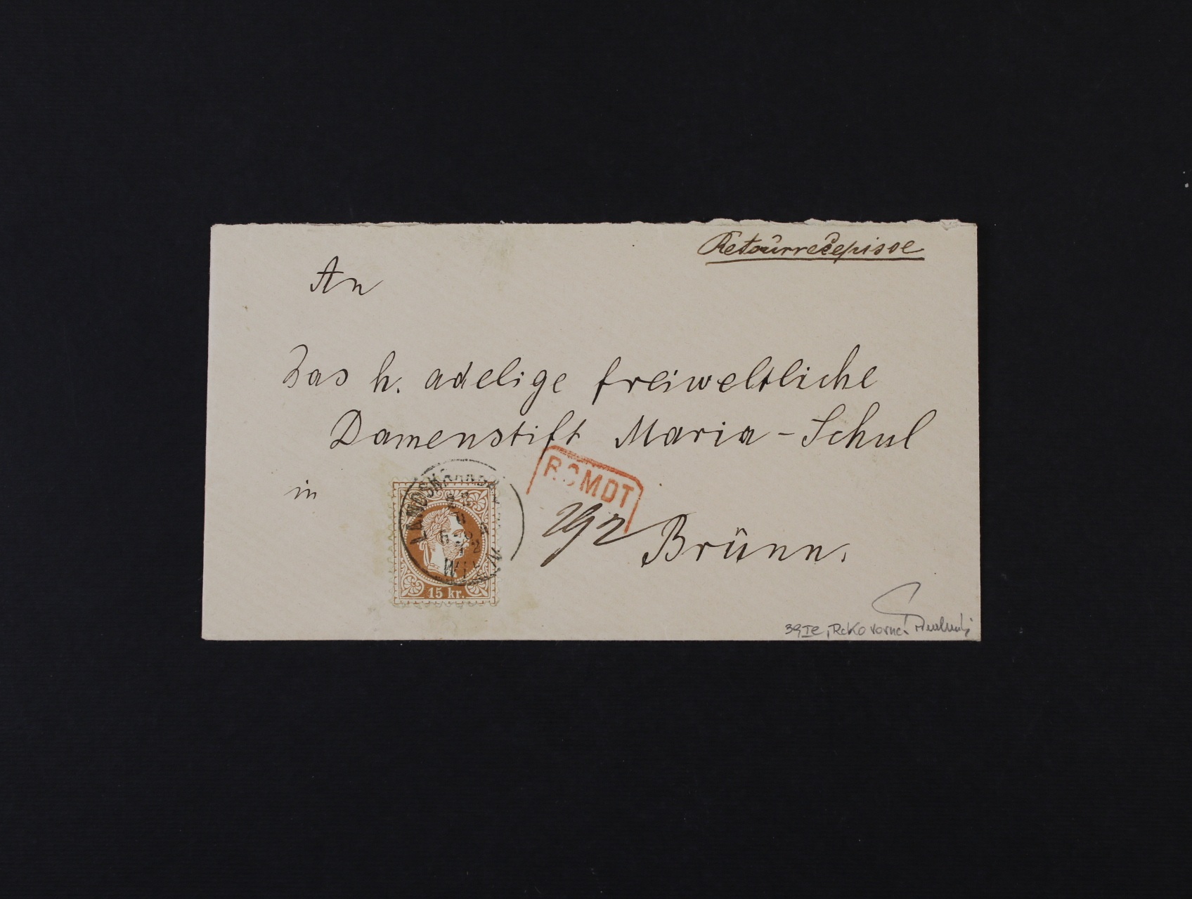 firemní R-dopis do Brna se zaplaceným portem i R-poplatkem na přední str. zn. Fe. č. 36 Ie červenohnědá, pod. raz. LANDSKRONGASSE WIEN 23.6.72 + přídavné rámeč. raz. RCMDT a poznámka v pravém horním rohu Retourrecepisse, přích. raz. BRÜNN 23.6.72 a firemní zálepka, lux. kvalita