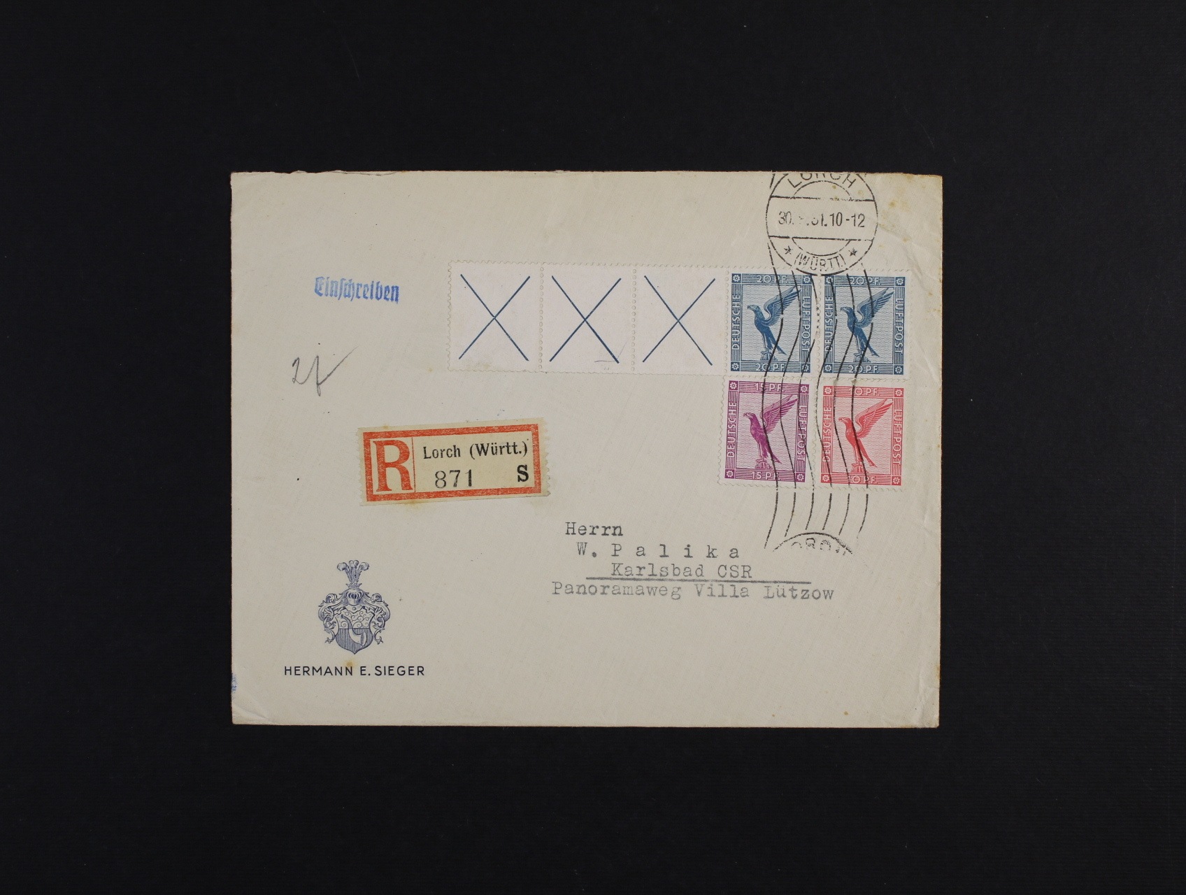 • firemní R-dopis (Hermann E. Sieger) do ČSR frank. zn. Mi. č. 378, 379, 380 RL (dvoupáska se třemi kupony), pod. raz. LORACH 30.SEP.31 + firemní zálepka a raz.