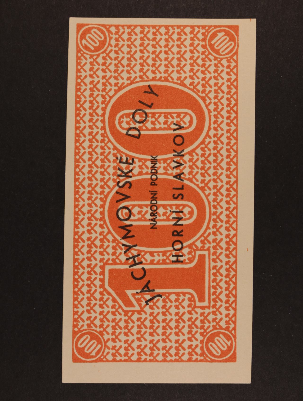Jáchymovské doly n.p. Horní Slavkov, poukázka 100 K b.d. ve červené barvě