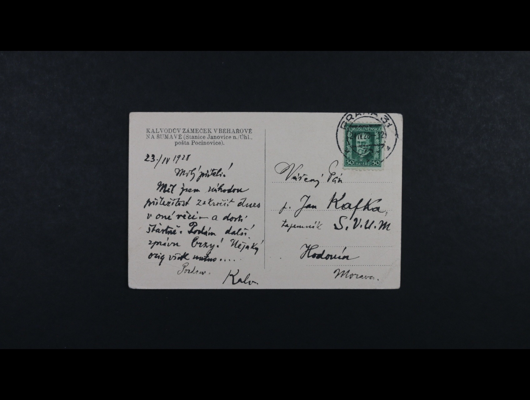 • Kalvoda Alois 1875 - 1934, český malíř a grafik - vlastnoručně psaná pohlednice z r. 1928 s vlastnoručním podpisem