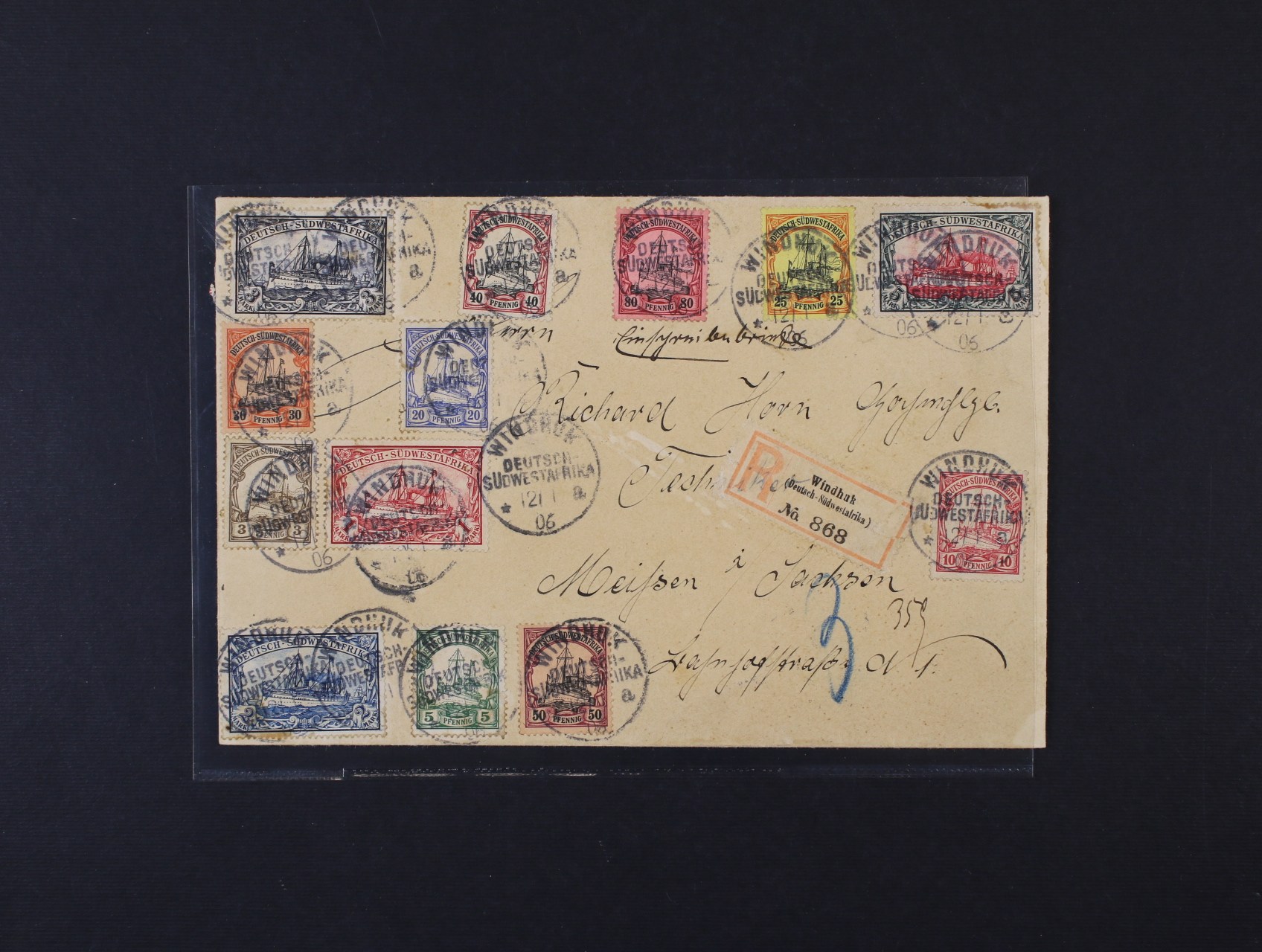 kolonie Jihozáp. Afrika - R- dopis z WINDHUK do Míšně s vysokou pestrou frankaturou, pod. raz.WINDHUK 21.1.06, řádně prošlý Satzbrief, jen raz. zn. kat. 610 EUR pro přefrank. dopis
